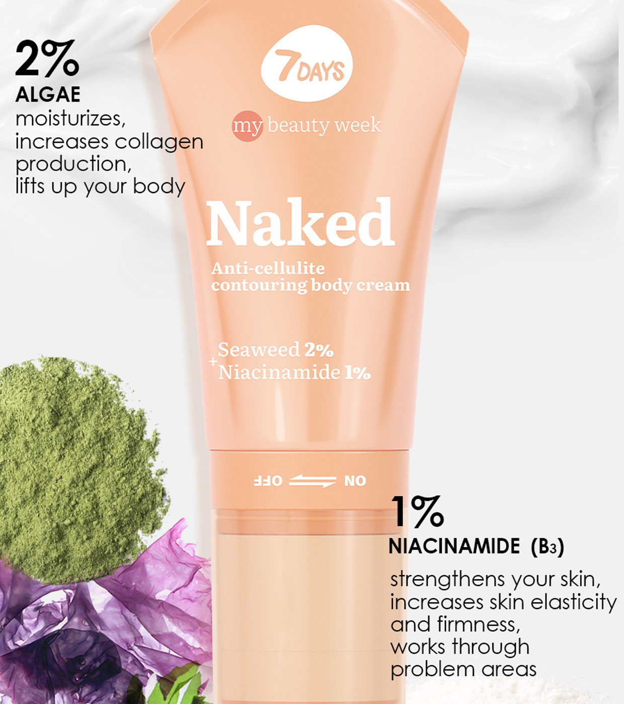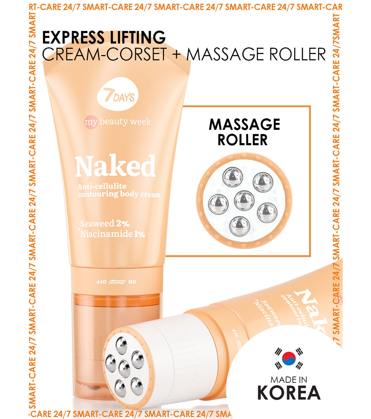 Experimente o poder do Creme Contorno + Hidratante + Rolo de Massagem 3 em 1 7DAYS , uma combinação revolucionária de massagem 3D e cosméticos coreanos com ingredientes ativos como algas e niacinamida.