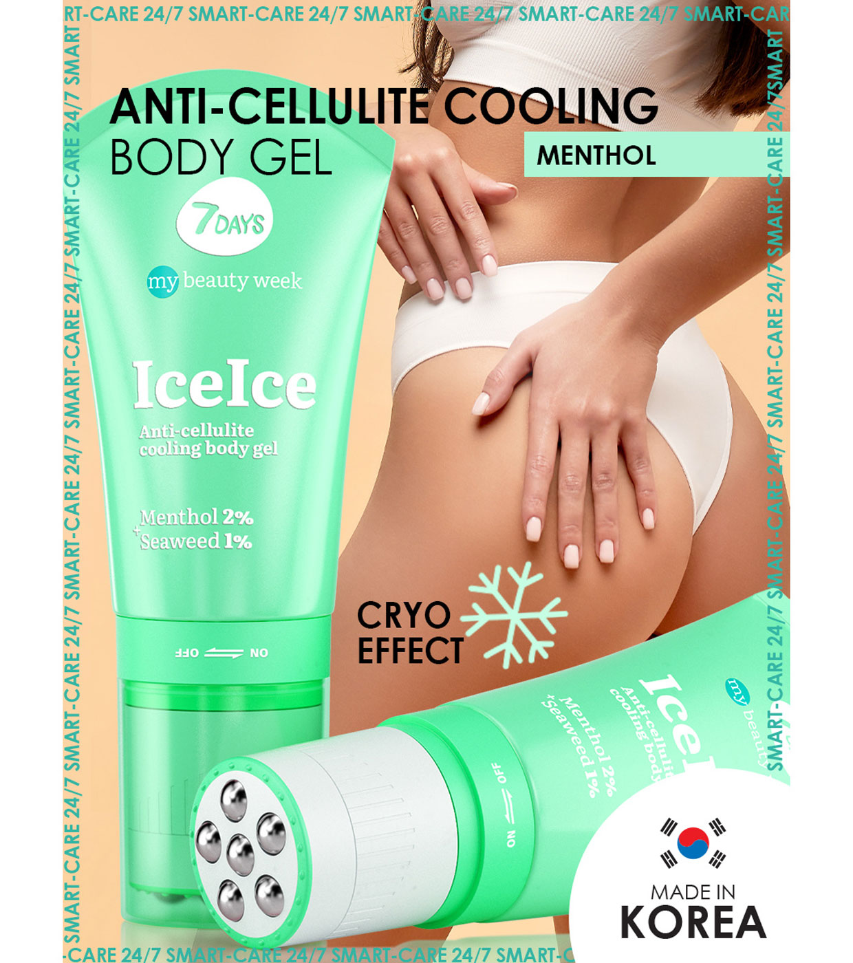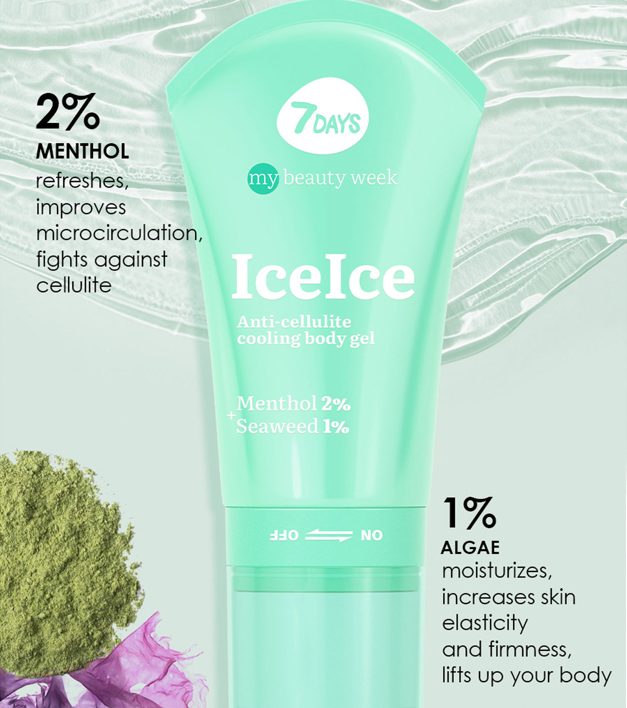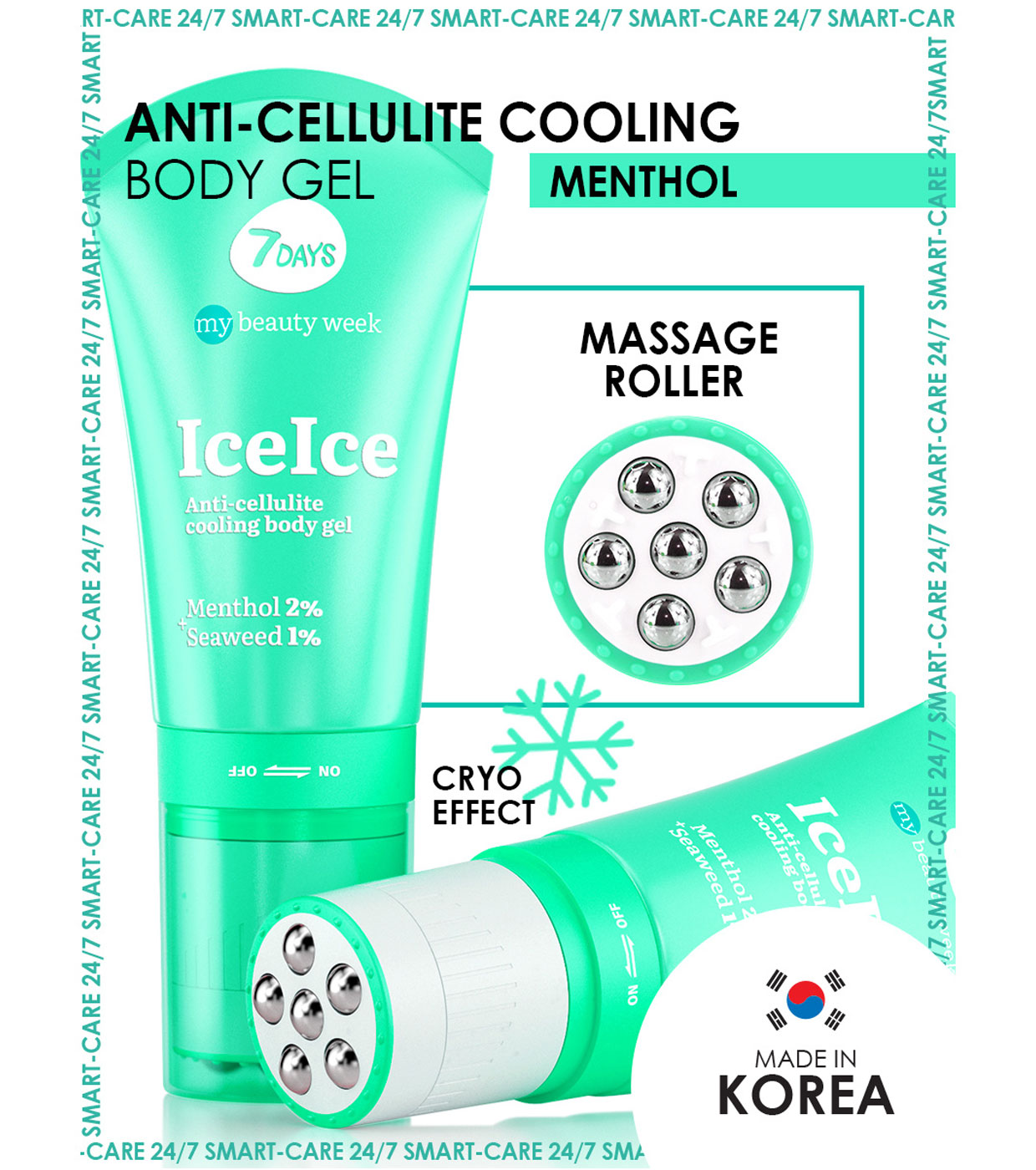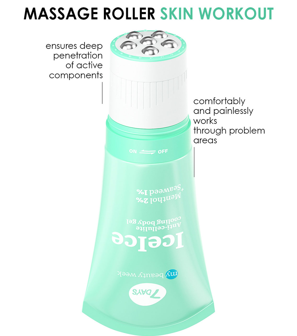 Descubra o poder do crio-gel + rolo de massagem 2en1 7DAYS ICEICE , uma combinação única de massagem 3D e cosméticos coreanos com ingredientes ativos como mentol e algas.