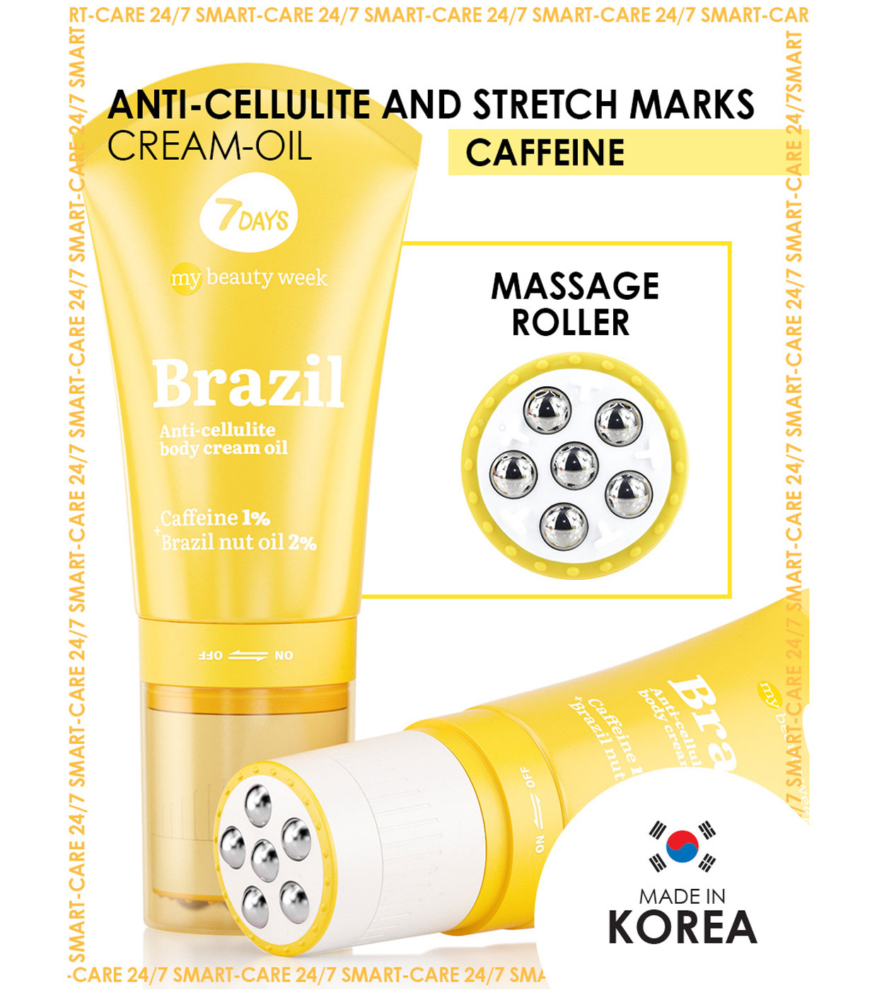 Experimente o poder do Creme Modelador + Óleo de Massagem + Roller 3 em 1 7DAYS, uma combinação inovadora de massagem 3D e cosméticos coreanos com princípios ativos como cafeína e óleo de castanha do Pará.