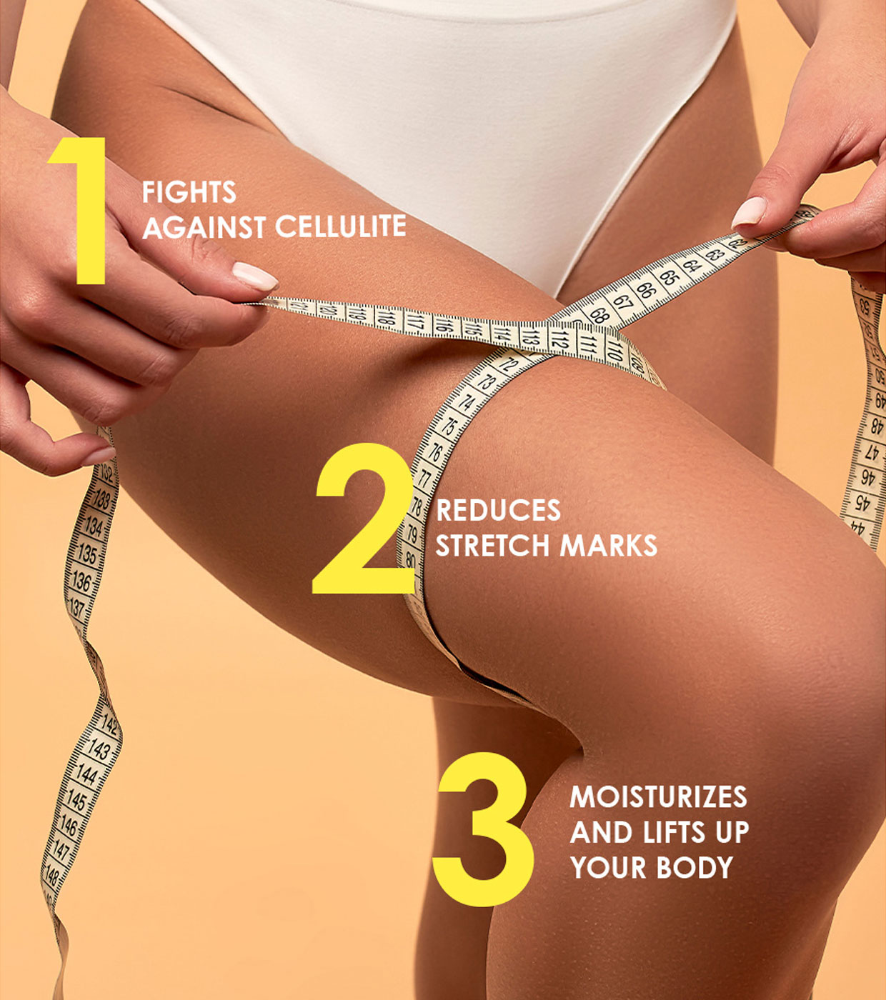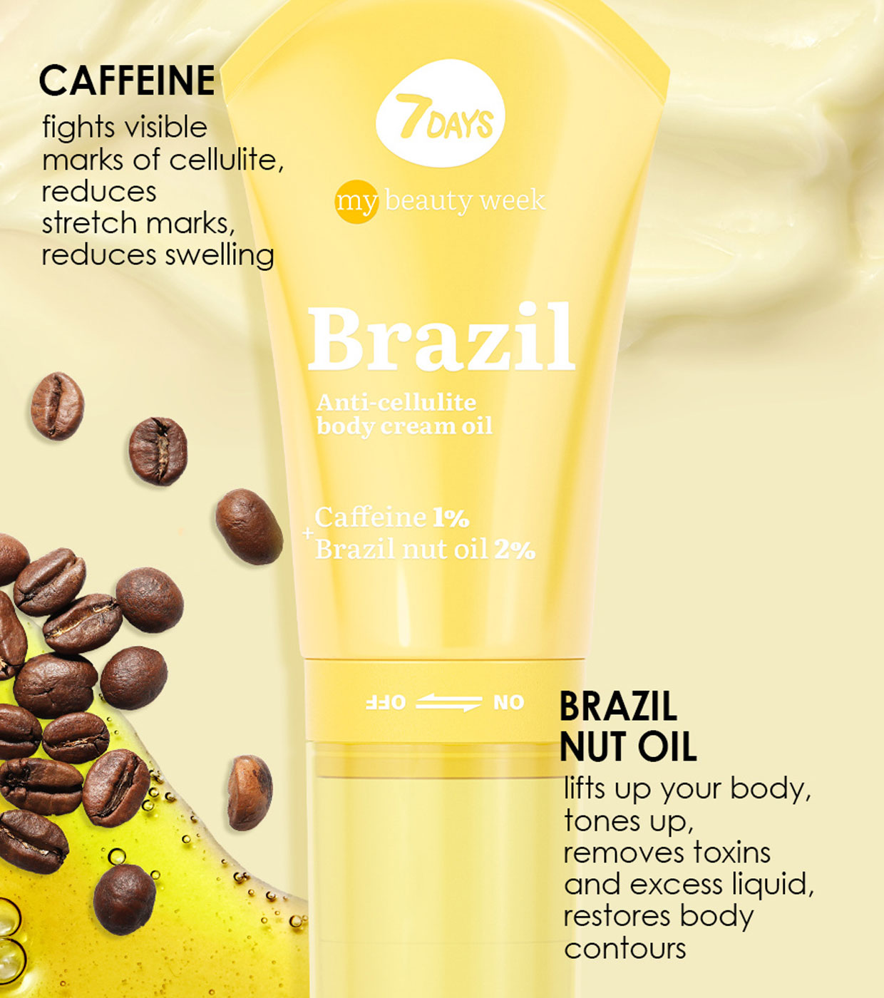A cafeína, reconhecida pela sua capacidade de combater as marcas visíveis da celulite, tonifica a pele e ajuda a eliminar o excesso de líquidos. O óleo de castanha do Pará proporciona poderoso efeito lifting, nutre, suaviza e renova a pele.