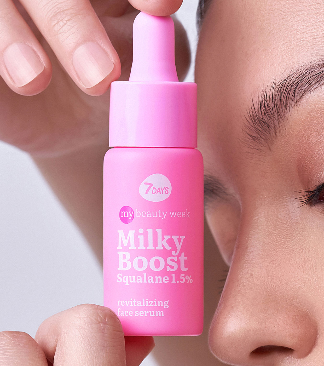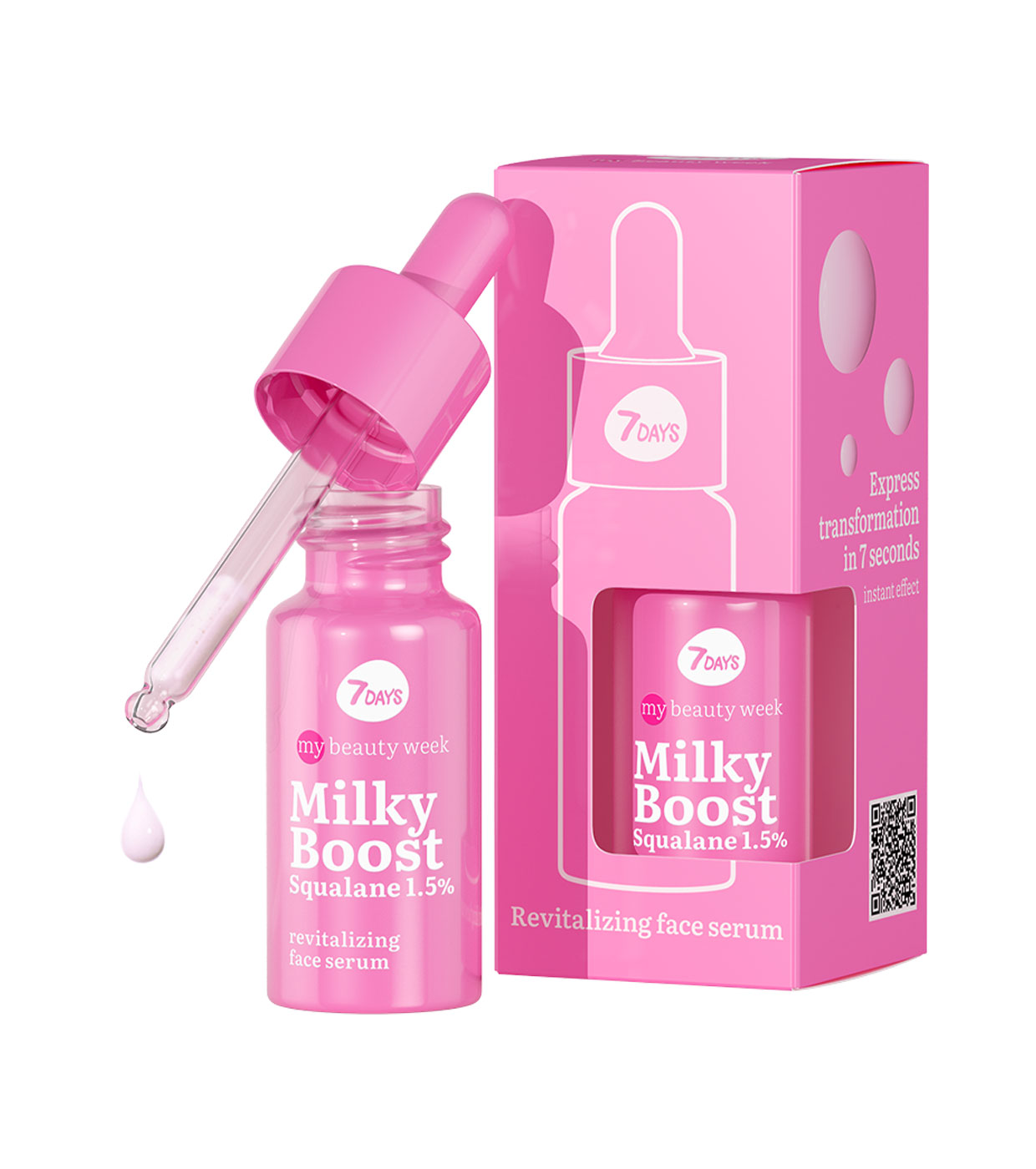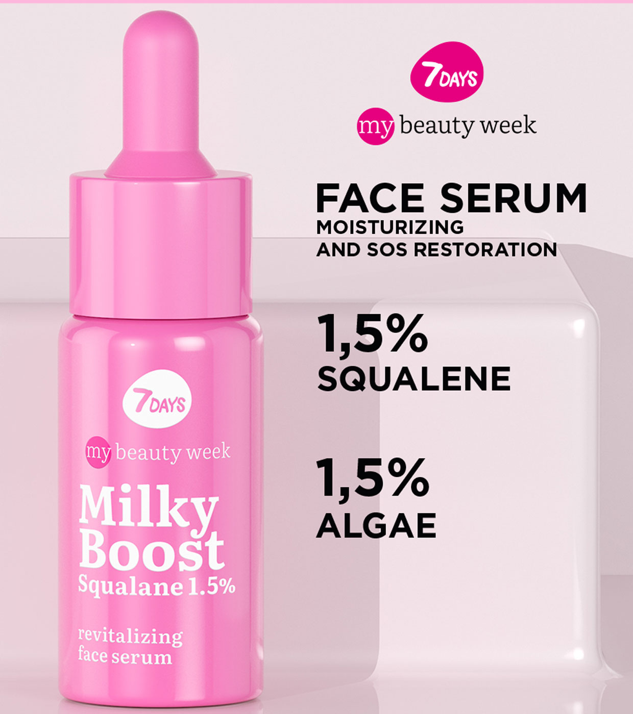 Experimente restauração imediata e hidratação profunda com o Sérum-Concentrado Facial Squalane 7DAYS MILKY BOOST , parte da linha MY BEAUTY WEEK SMART care..