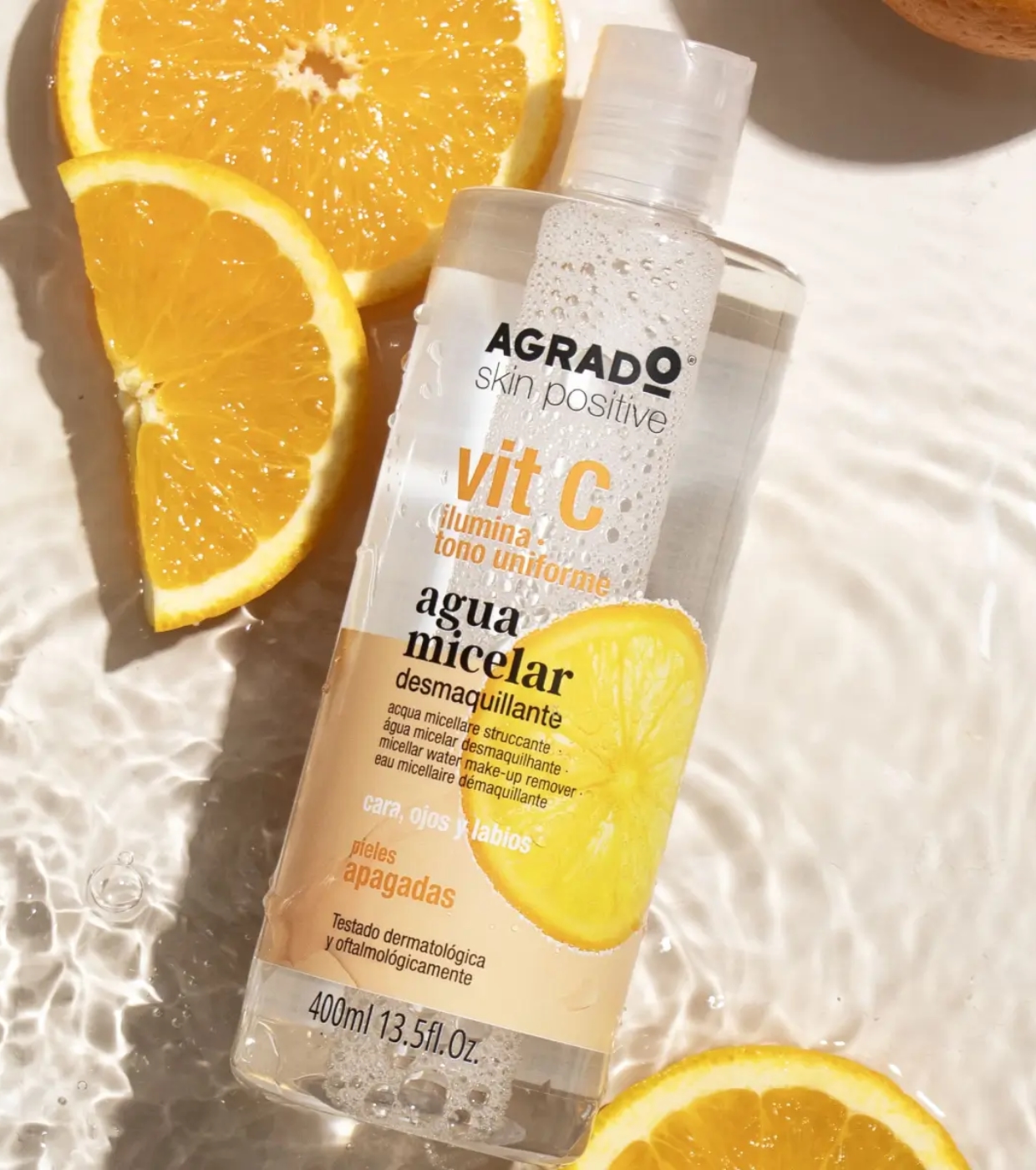 Limpe, remova a maquiagem e cuide da sua pele com Agrado. Água Micelar de Limpeza com Vitamina C.