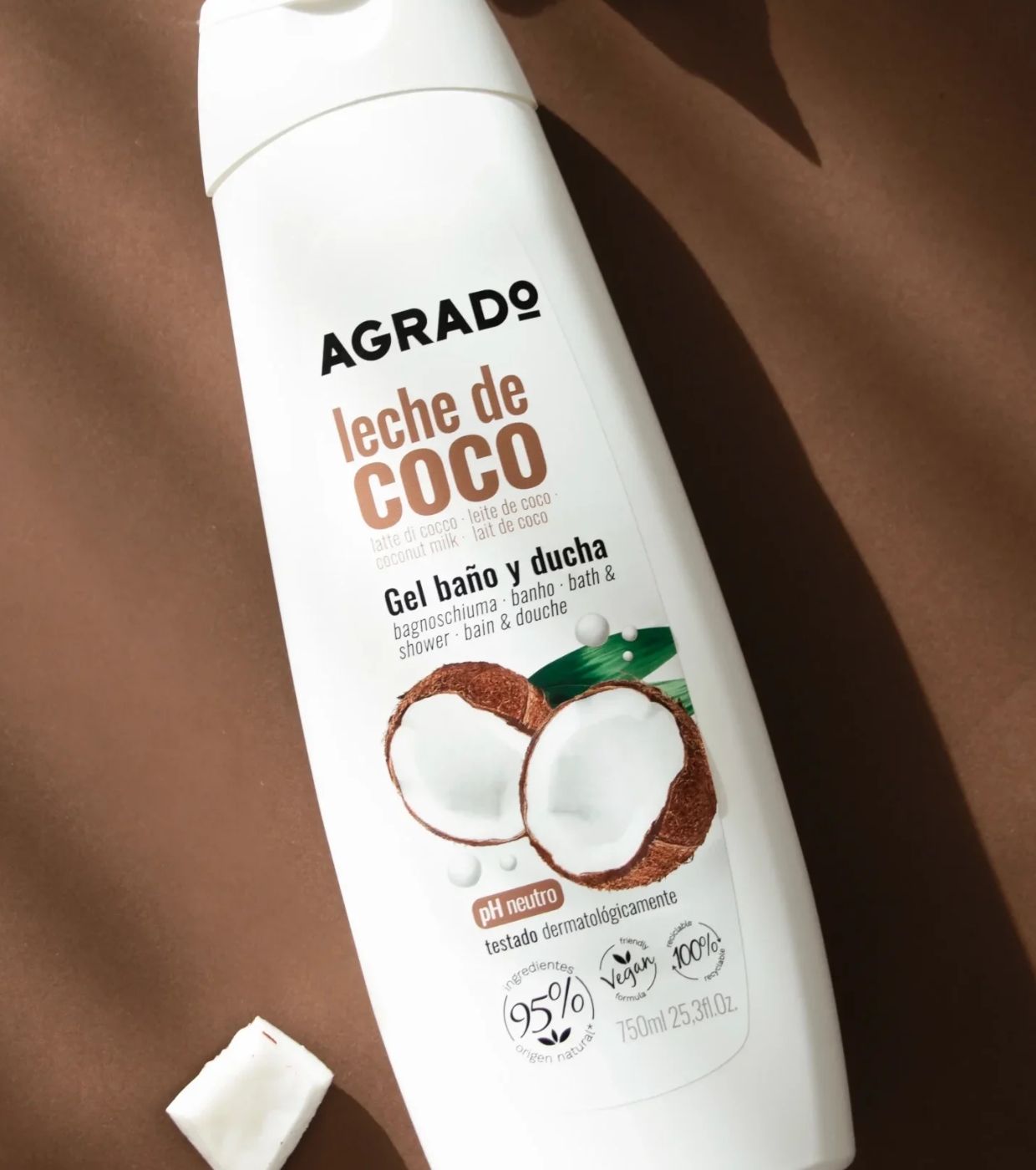 Agrado Cosmético para banho de leite de coco e gel de banho formulado para cuidar, limpar e amaciar a pele.