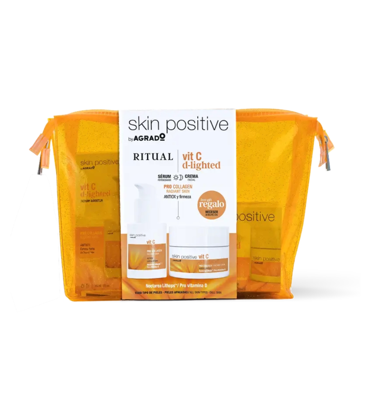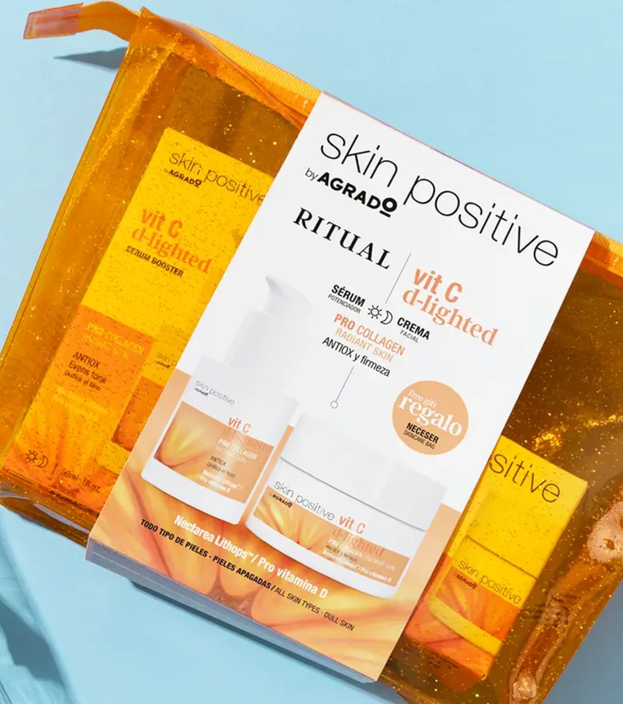 O Ritual Skin Positive Vit C D-Lighted da Agrado inclui o Sérum Facial Vit C D-Lighted e o Creme Facial Vit C D-Lighted, uma combinação desenvolvida para revitalizar a pele opaca e restaurar o brilho, a uniformidade e a firmeza.