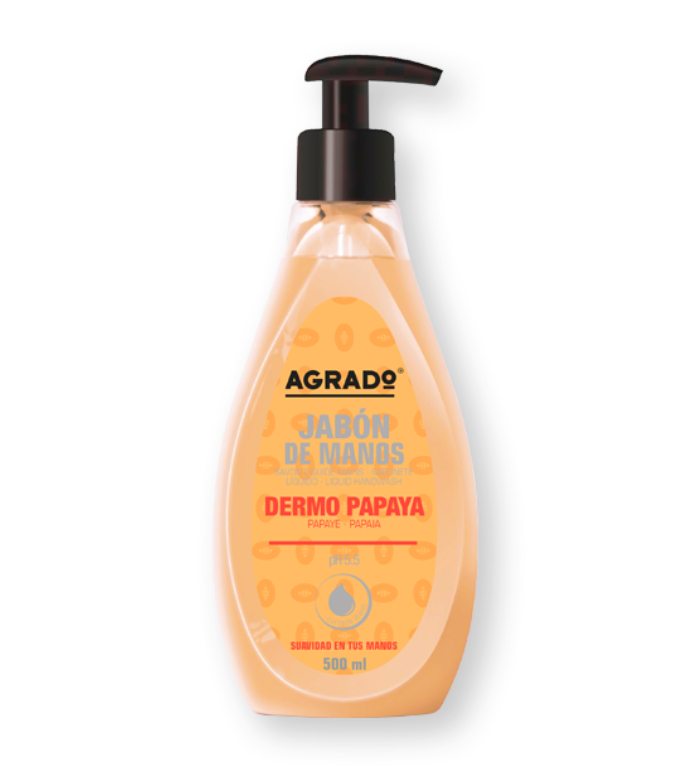 O Sabonete de Mãos Dermo Mamão da Agrado Cosmetics com pH Neutro e leve aroma de Mamão.