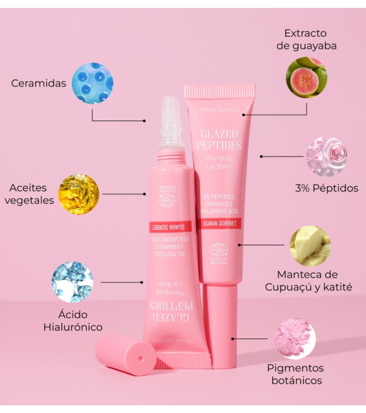O bálsamo labial volumizador Glazed Peptides da Alma Secret é um tratamento labial intensivo que hidrata profundamente, suaviza, atenua linhas finas e revitaliza lábios ressecados, proporcionando cor, volume e brilho.