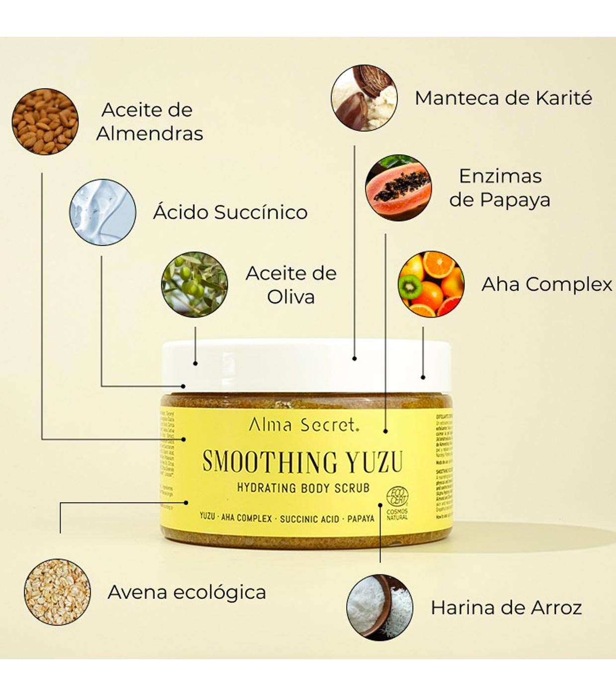 Sacarosa, Aqua (agua termal), Estearato de glicerilo SE, Alcohol cetearílico, Aceite de Prunus Amygdalus Dulcis, Mantequilla de Butyrospermum Parkii*, Ácido succínico, Extracto de fruta de Carica Papaya, Extracto de Officinarum, Extracto de fruta de Citrus Aurantium Dulcis, Extracto de fruta de Citrus Limon, Extracto de Hacer Saccarum , glicerina, aceite de fruta Olea Europaea, ácido esteárico, tocoferol, palmitato de ascorbilo, goma xantana, sorbato de potasio, benzoato de sodio, aceite de cáscara de Citrus Junos, aceite de cáscara de Citrus Paradisi, aceite de cáscara de Citrus Reticulata, aceite de cáscara de Citrus Sinensis expresado*, perfume, limoneno *, Linalol*, Citral**, Geraniol**.
