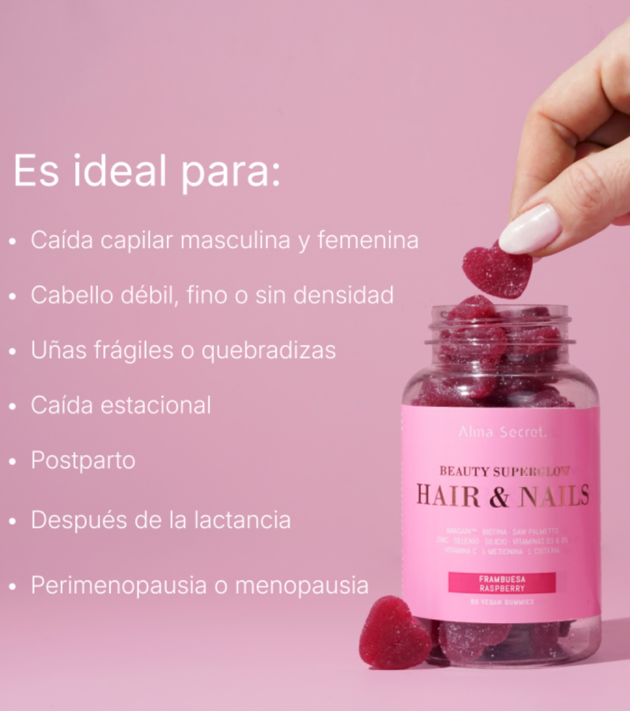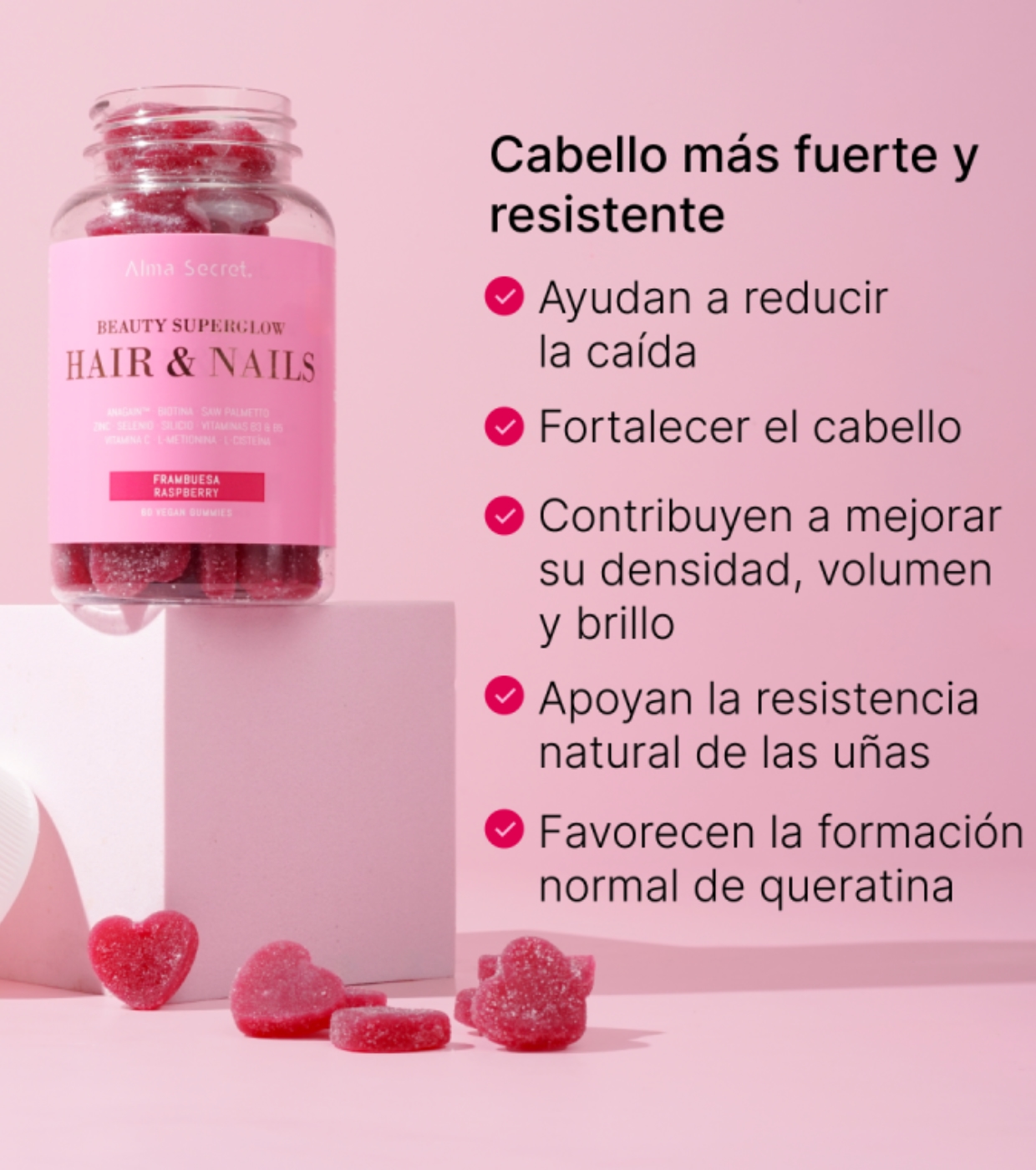 Edulcorante: Jarabe de maltitol; agua osmotizada, edulcorantes sorbitol, maltitol plv; L-Metionina, L-Cisteína, espesante: pectina; E.S de brotes de guisantes en polvo - AnaGainTM Un (Pisum sativum, Brotes orgánicos, Isomaltosa), E.S. Acerola [(Malpighia punicifolia L., fruto, Maltodextrina), 25% Vitamina C], E.S. Bambú [(Bambusa arundinacea (Retz.) Willd, Brote (tallos florales, hojas y tallo principal), Maltodextrina) 70% silice] E.S. Saw Palmetto (Serenoa repens, baya, maltodextrina), Acidulante: ácido cítrico; Aroma natural, Aroma natural (Edulcorante), Vitamina B3 (Nicotinamida), Colorante (concentrados de frutas y vegetales), Acidulante: citrato de sodio; Citrato de zinc, Edulcorante: Sucralosa, Vitamina B5 (D-Pantotenato cálcico), Vitamina B8 (Biotina), Selenio (Selenito de sodio). Recubrimiento: edulcorante: maltitol plv. Contiene edulcorantes.