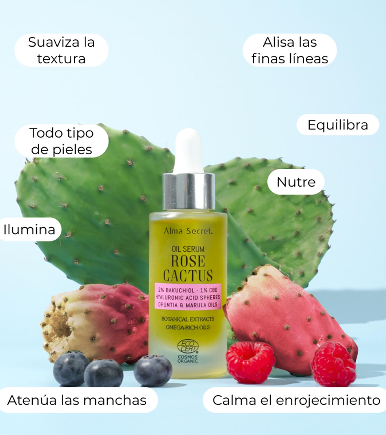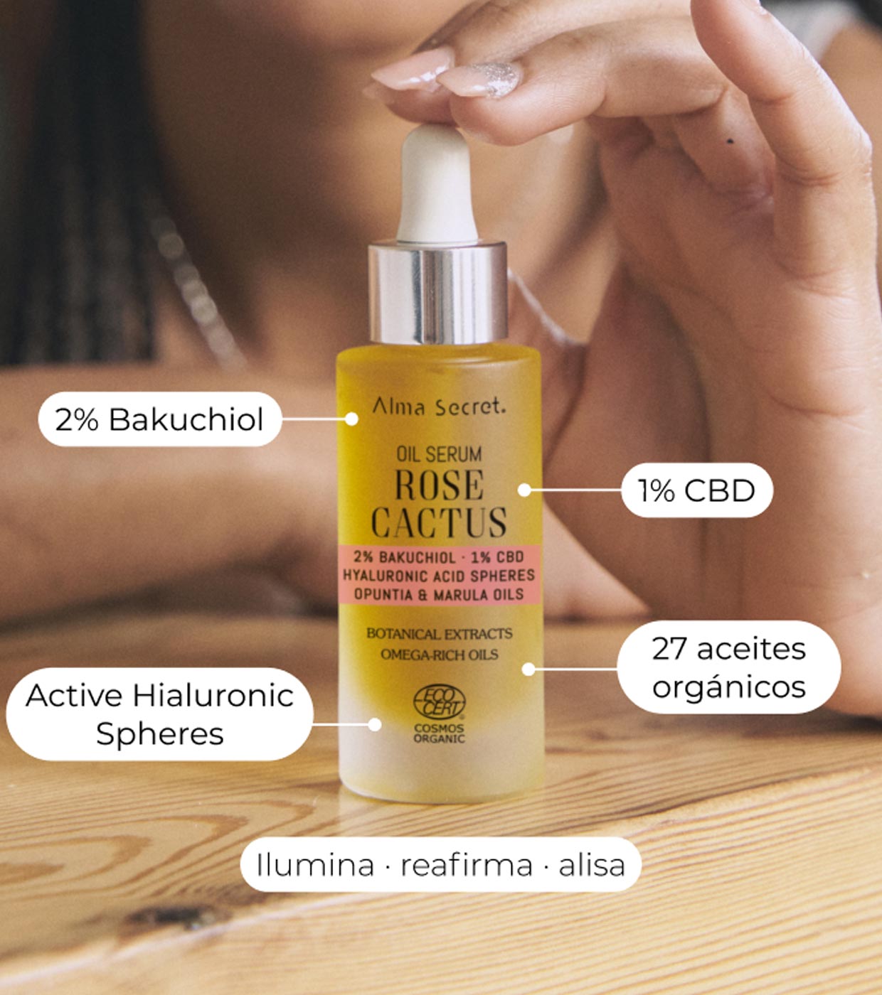 Rose Cactus Oil da Alma Secret é um óleo facial de última geração, adequado para todos os tipos de pele, que atua ativando a renovação celular, reconstruindo e fortalecendo a barreira cutânea, melhorando a sua resistência aos gatilhos do stress diário., revitalizando a pele stressada. e aumentando sua luminosidade.