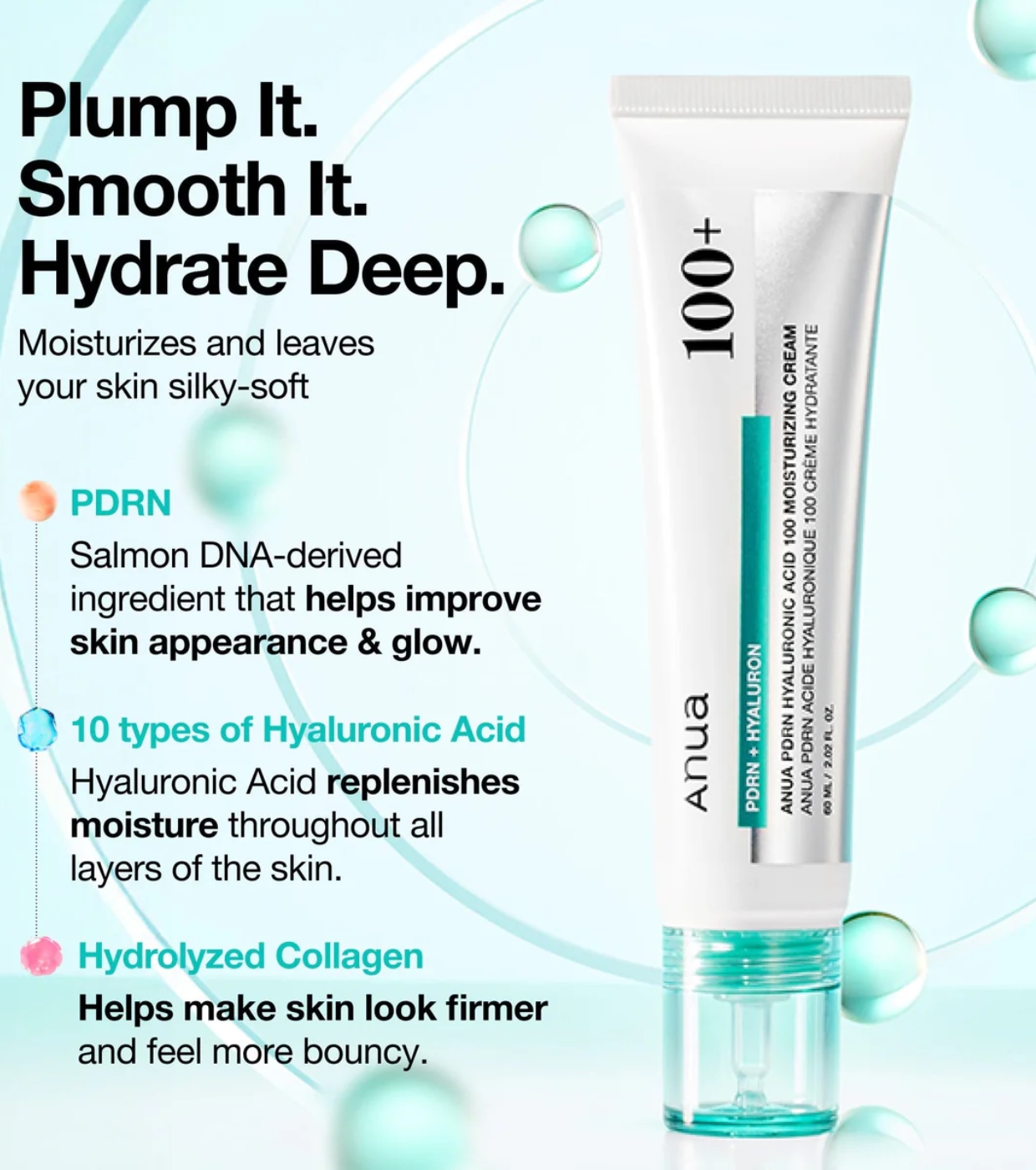 PDRN Hyaluronic Acid 100 Anua Creme Hidratante ajuda a reparar, hidratar e firmar profundamente a pele.