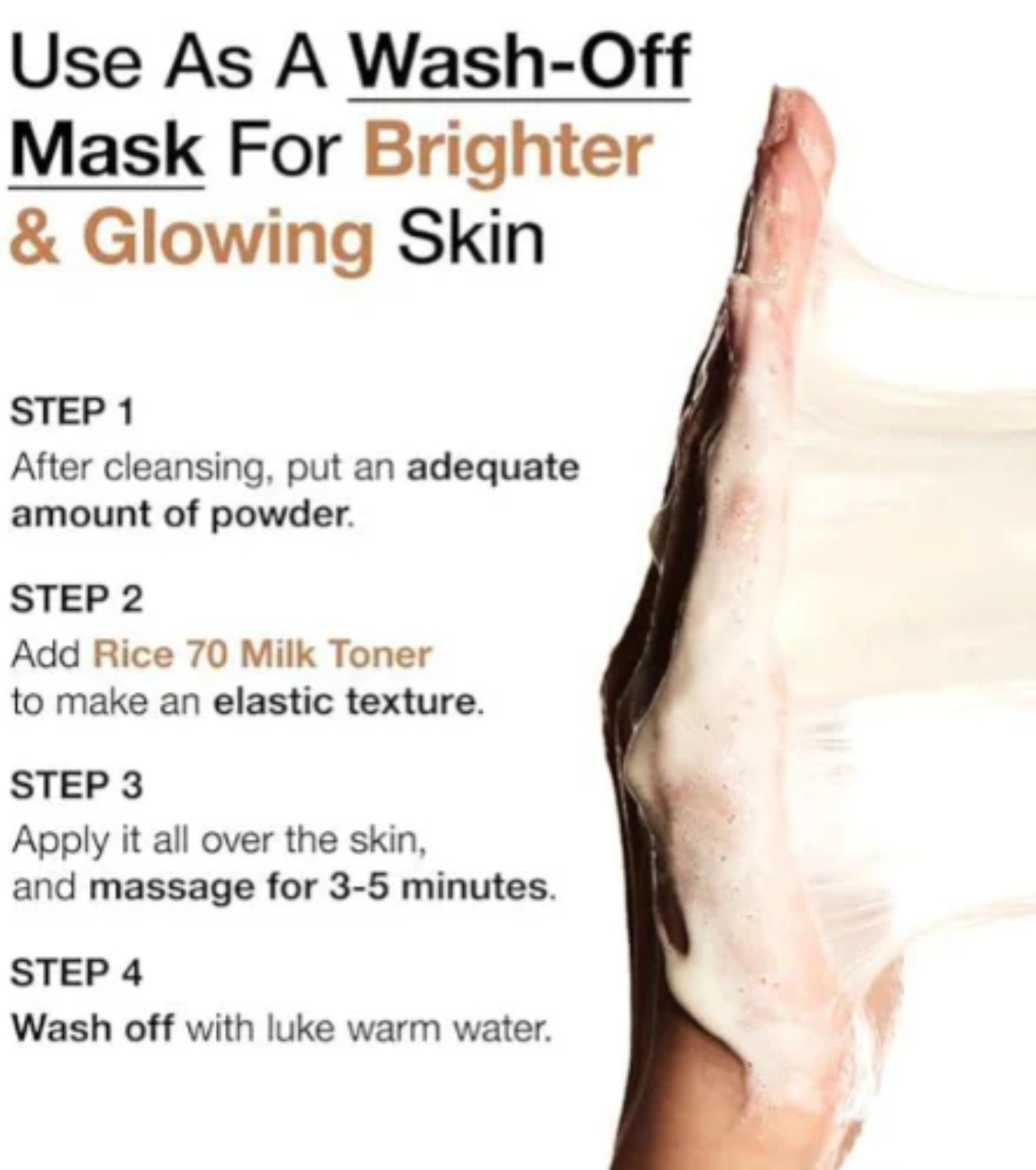 Para máscara facial: Misture o pó com 1-1,5 colheres de chá de água até obter consistência elástica. Aplicar uniformemente na pele e massajar durante 3-5 minutos. Em seguida, enxágue com água morna.