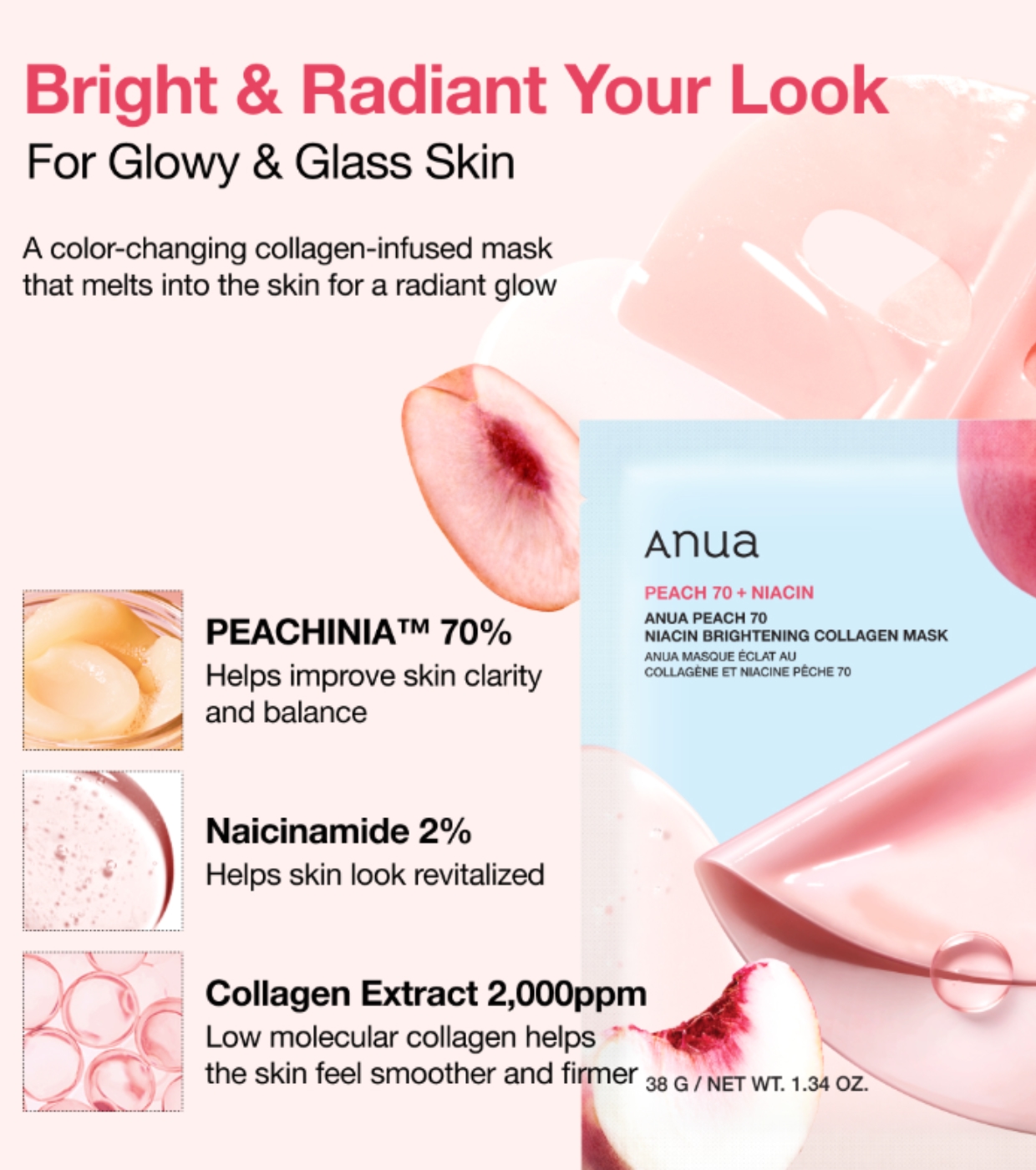 Peach 70 Máscara Iluminadora de Colágeno Anua é uma máscara inovadora que hidrata, ilumina e firma a pele graças à sua fórmula enriquecida com água de pêssego, niacinamida e colágeno de baixo peso molecular (300Da).