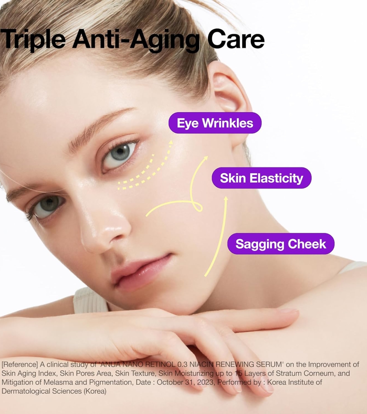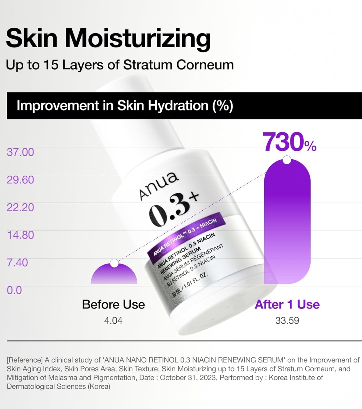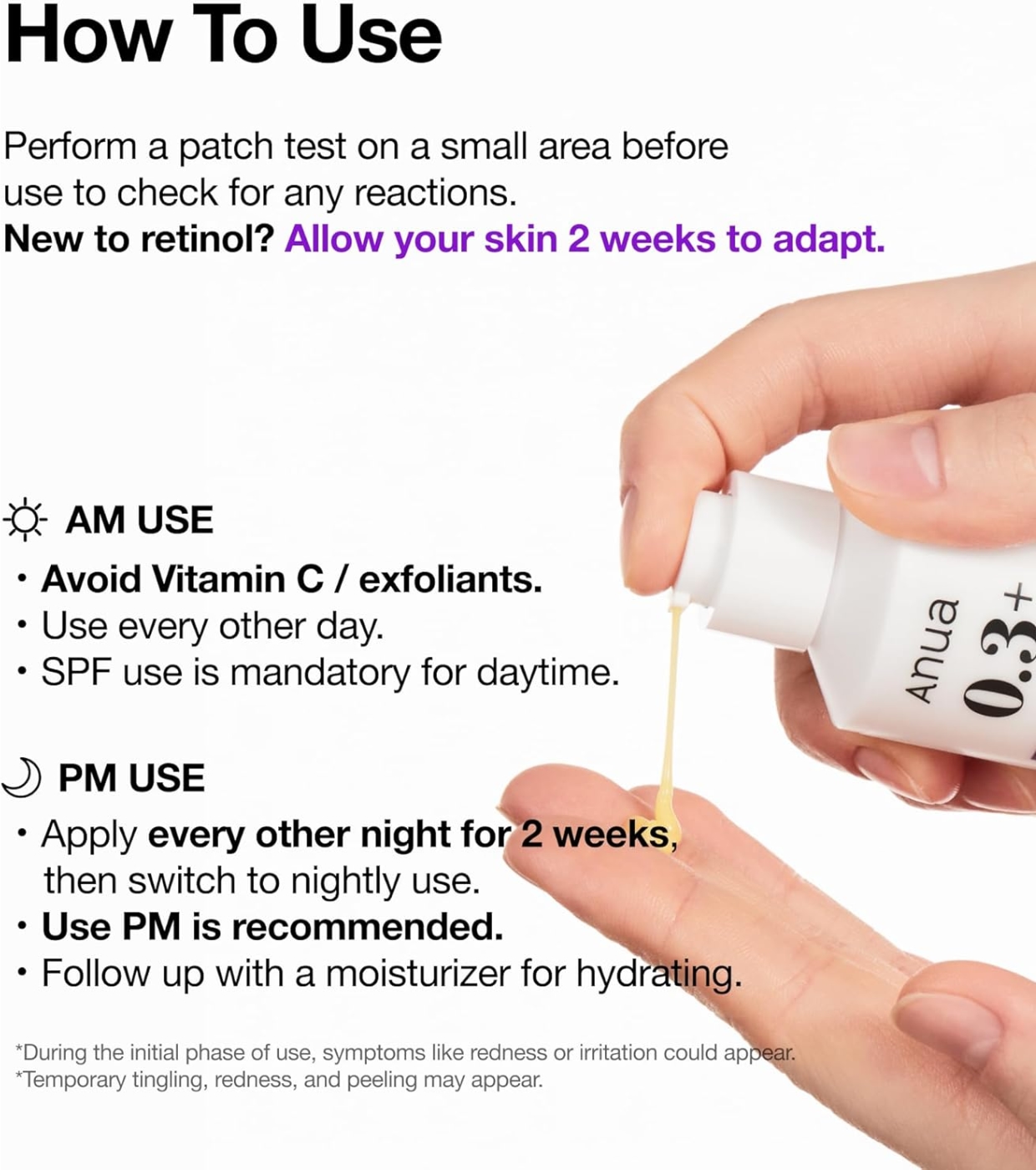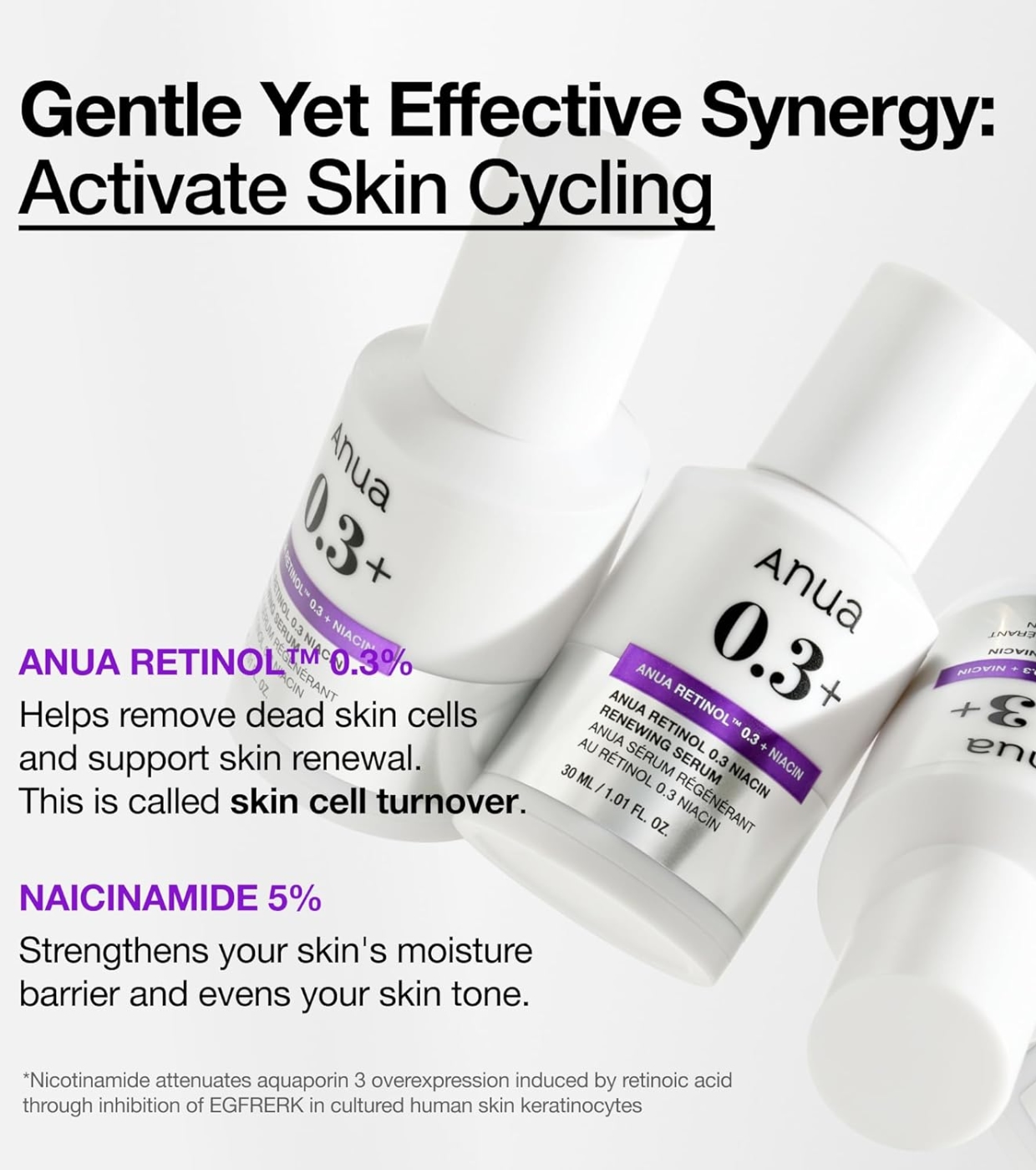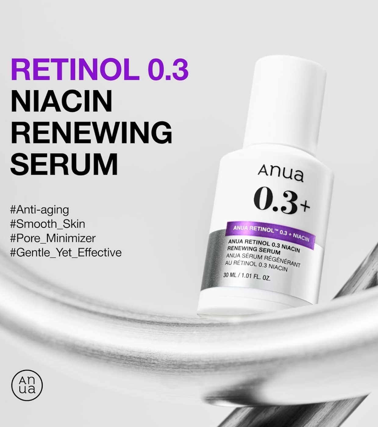 O sérum noturno renovador com 0,3% de retinol + niacinamida da Anua é ideal para quem busca tratar sinais de envelhecimento, hiperpigmentação e textura irregular da pele sem causar irritação.