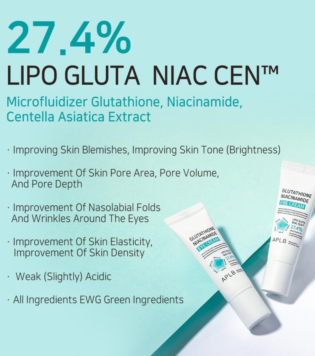 O Glutathione Niacinamide Eye Cream da APLB é um creme leve para os olhos formulado para hidratar, iluminar e melhorar a elasticidade da pele delicada ao redor dos olhos.