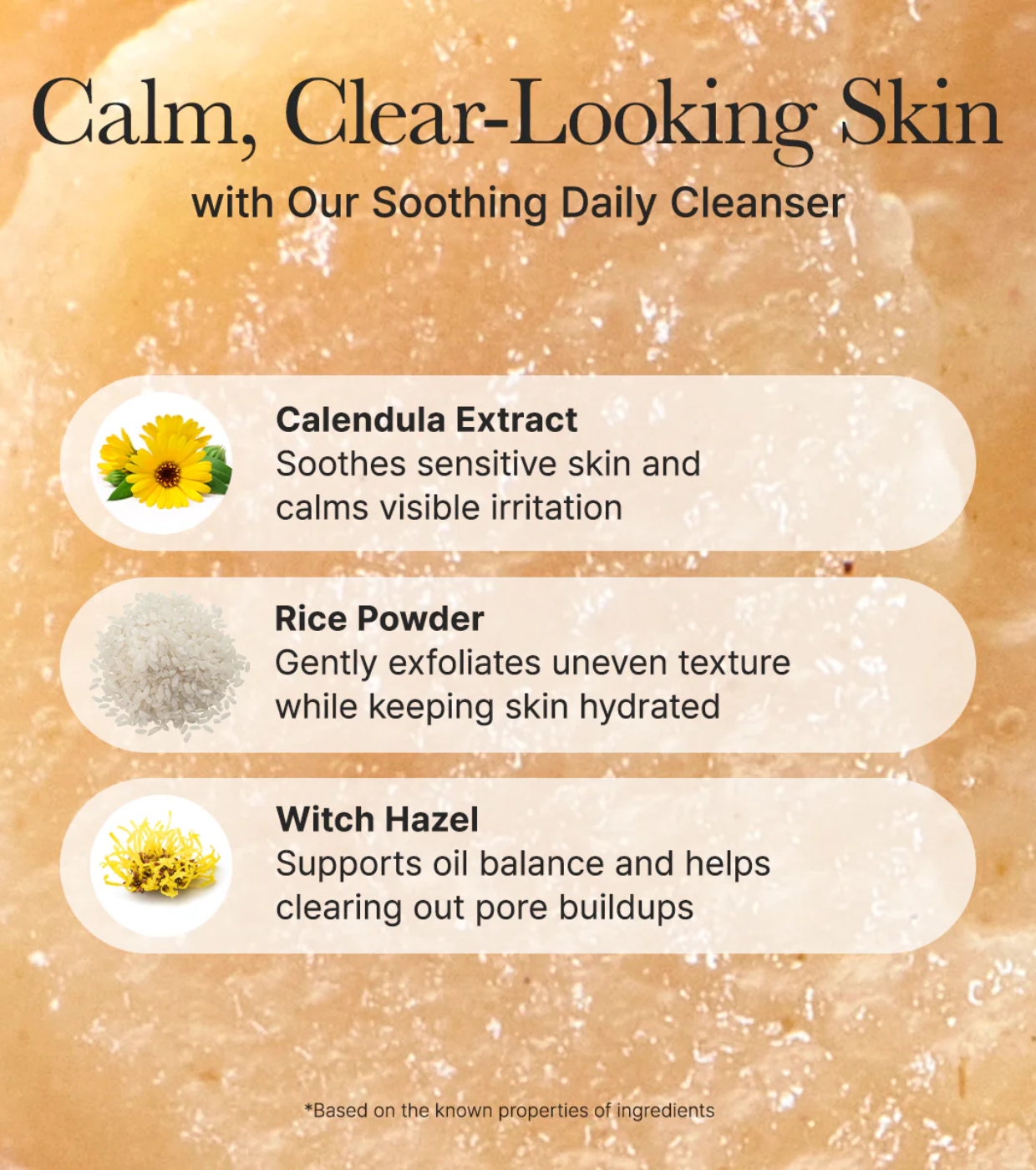 Glycerin, Water, Sodium Cocoyl Isethionate, Sodium Cocoyl Glycinate, Prunus Amygdalus Dulcis (Sweet Almond) Seed Meal, 1,2-Hexanediol, Coconut Acid, Sodium Methyl Cocoyl Taurate, Cellulose, Oryza Sativa (Rice) Powder, Sodium Isethionate, Pyrus Malus (Apple) Fiber, Hamamelis Virginiana (Witch Hazel) Extract, Glyceryl Stearate, Hydroxypropyl Starch Phosphate, Sodium Chloride, Xanthan Gum, Fragrance, Gardenia Florida Fruit Extract, Ethylhexylglycerin, Dextrin, Disodium EDTA, Calendula Officinalis Extract, Houttuynia Cordata Extract, Opuntia Ficus-Indica Stem Extract