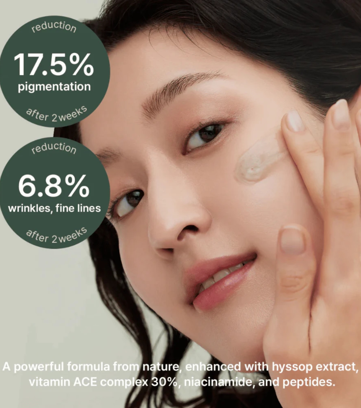 Sua fórmula avançada combina extrato de hissopo francês, complexo vitamínico ACE e niacinamida, ingredientes ativos essenciais que ajudam a reduzir manchas escuras, marcas pós-acne e descoloração, além de prevenir o aparecimento de novas irregularidades.