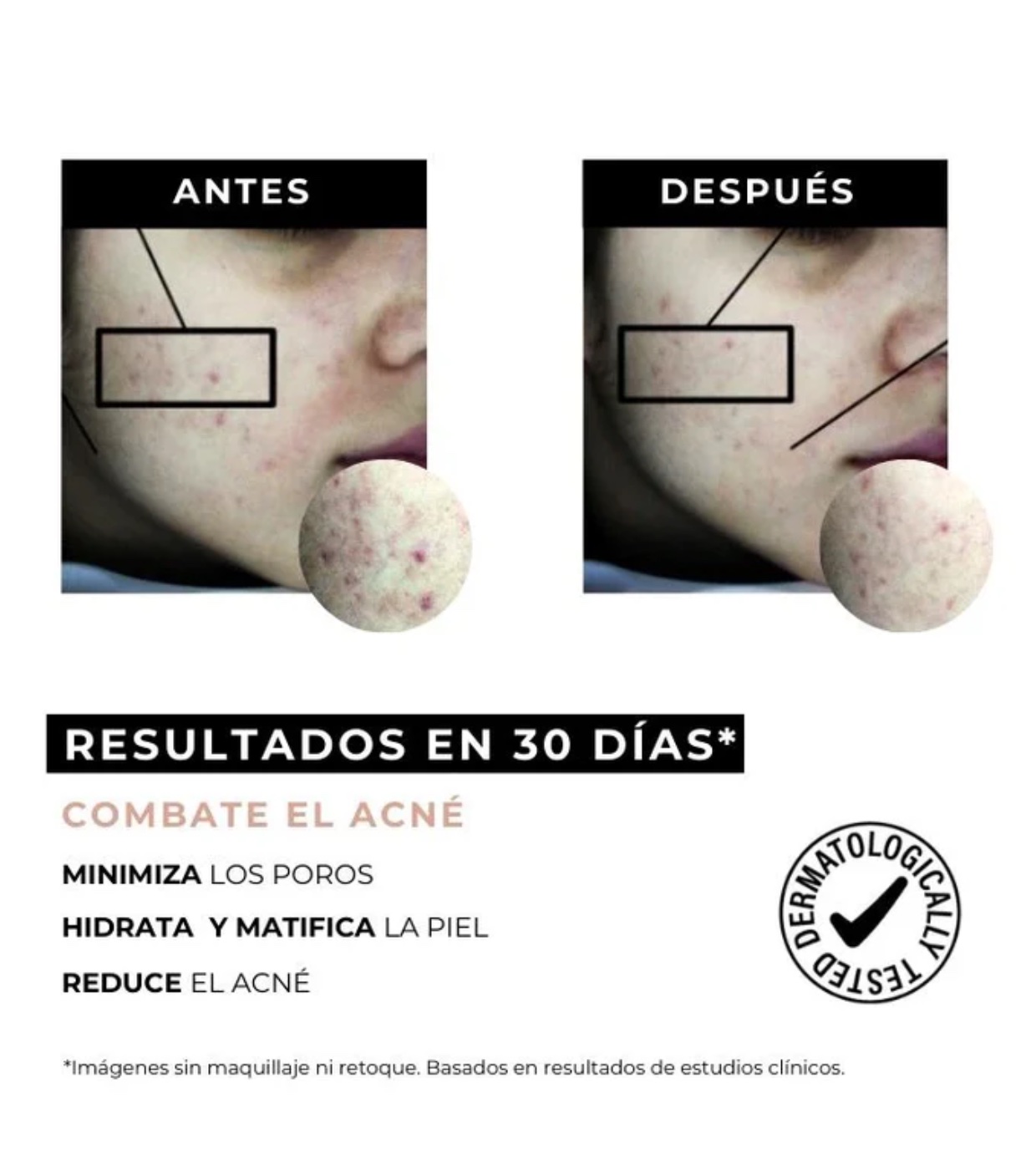 Reduz manchas e espinhas, previne o surgimento de novas espinhas, minimiza manchas (marcas ou manchas de acne) e uniformiza o tom da pele. Um hidratante diário que também ajuda a reduzir e prevenir o surgimento de acne.