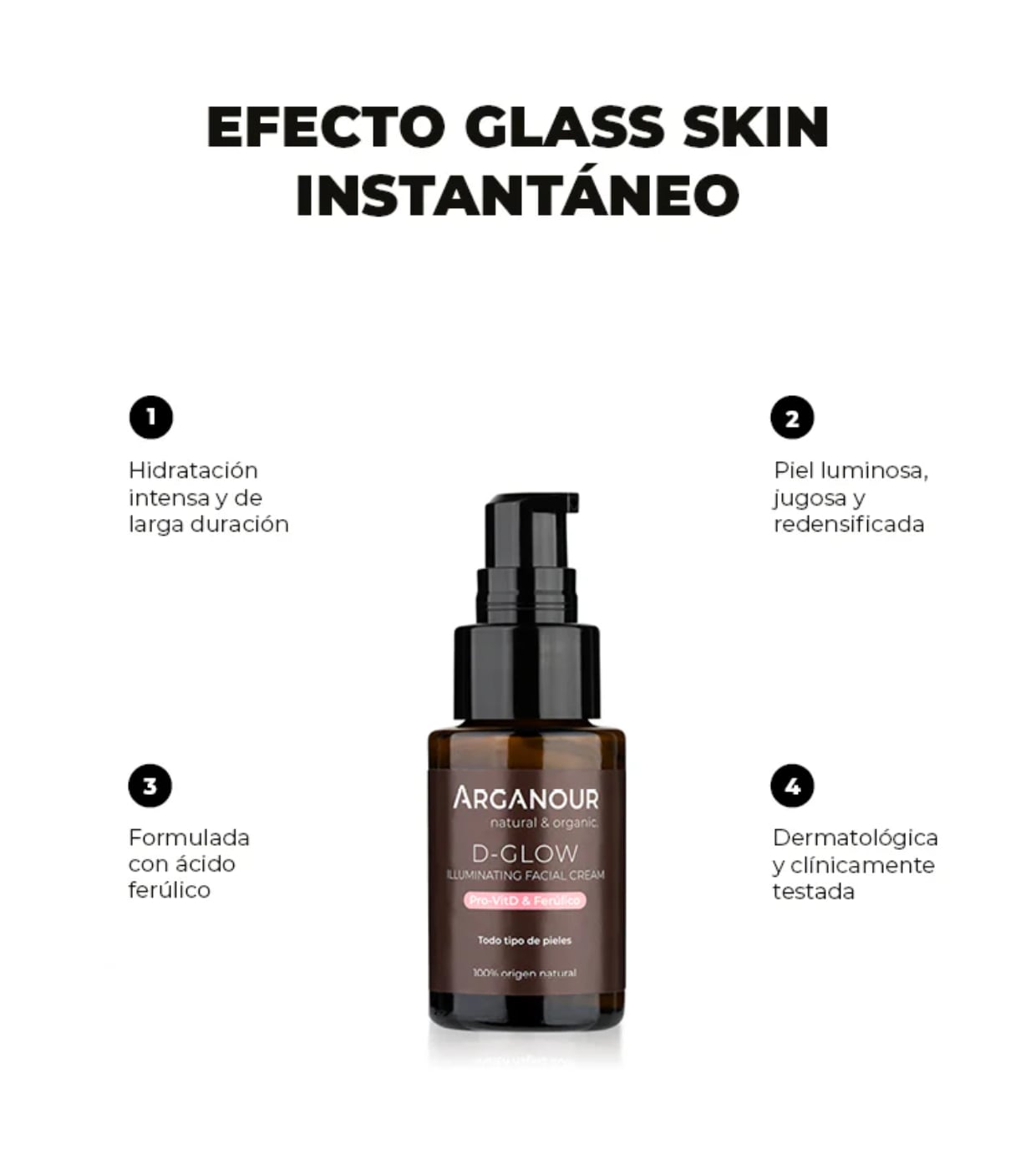 D-Glow é o melhor creme iluminador facial, pois proporciona à pele um incrível efeito de pele de vidro instantâneo: luminosidade, suculência, redensificação e turgor.