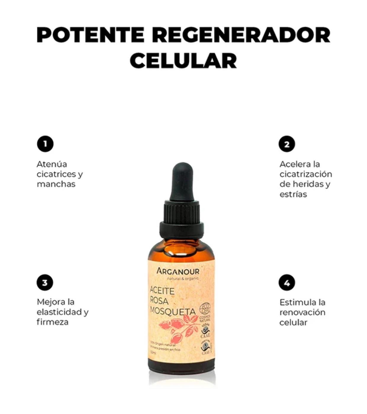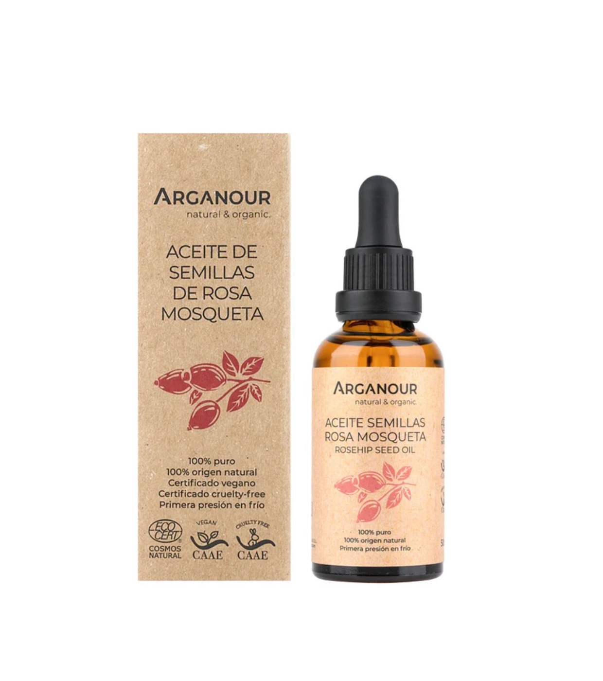 Arganour 100% puro óleo de rosa mosqueta é um óleo origem natural e primeira prensagem a frio que possui altas concentrações de ácidos graxos essenciais, tornando-o o cosmético perfeito para nutrir e regenerar a pele.