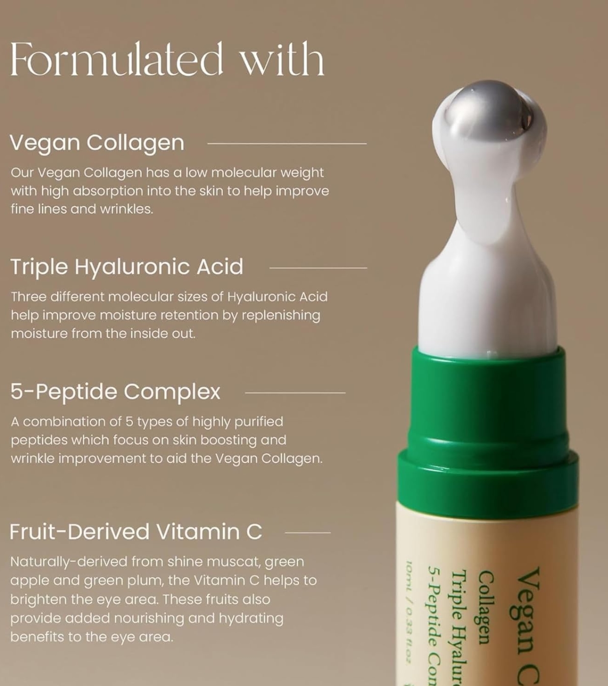 Sua fórmula combina colágeno vegano, um complexo de 5 peptídeos e extratos botânicos ricos em vitamina C, que proporcionam efeito firmador, iluminador e revitalizante.