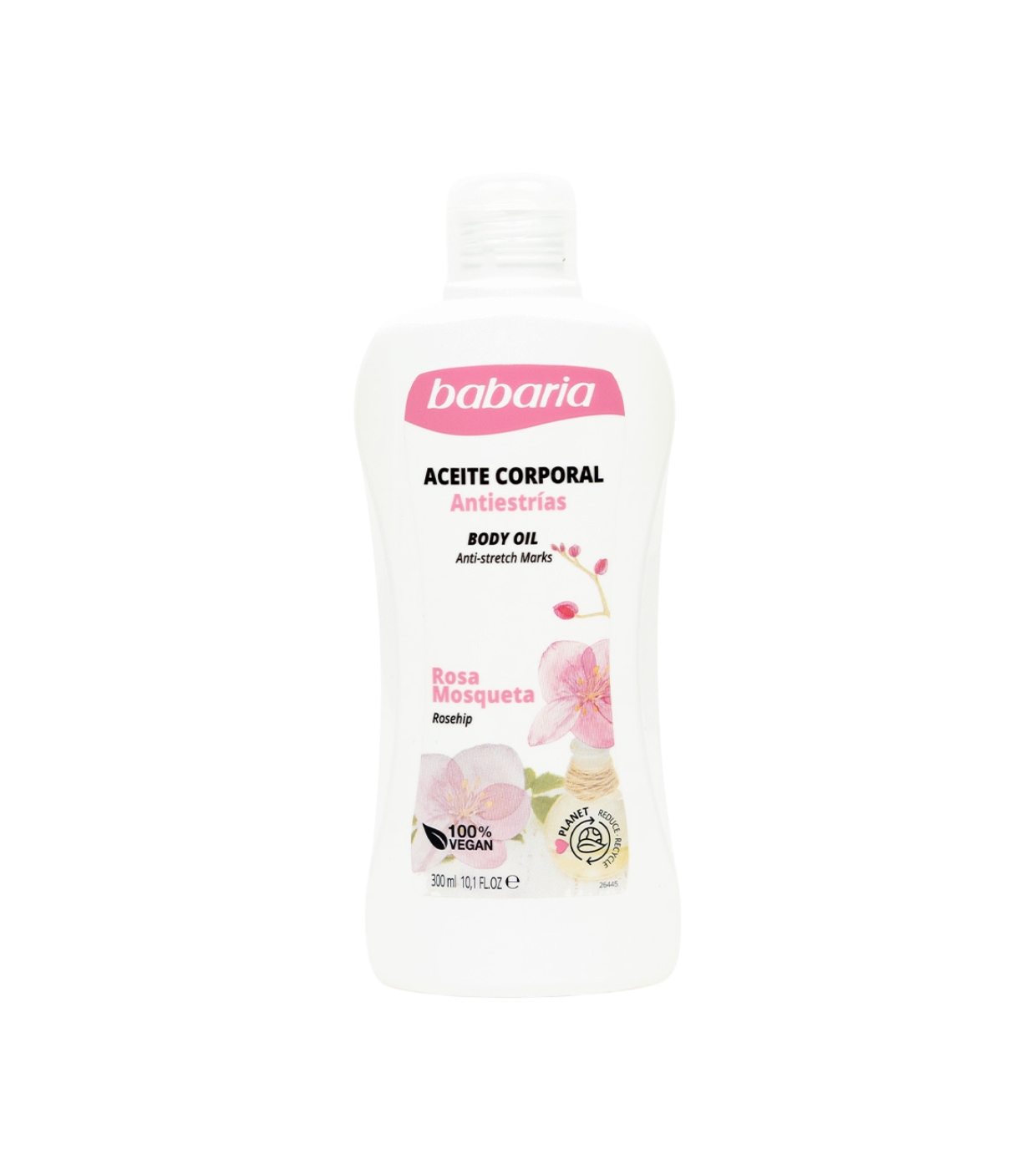 Babaria O Óleo Corporal Antiestrias de Rosa Mosqueta é especialmente formulado para nutrir intensamente e melhorar a elasticidade da pele, ajudando a prevenir e reduzir o aparecimento de estrias.