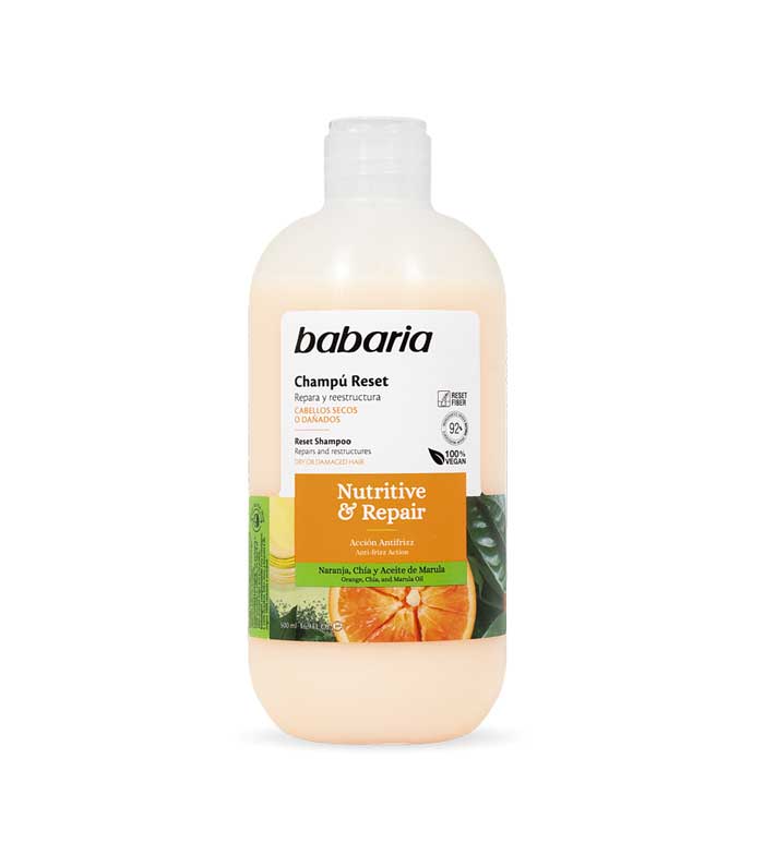 O shampoo reparador Babaria Reset Nutritive & Repair é especialmente adequado para cabelos secos e / ou danificados.
