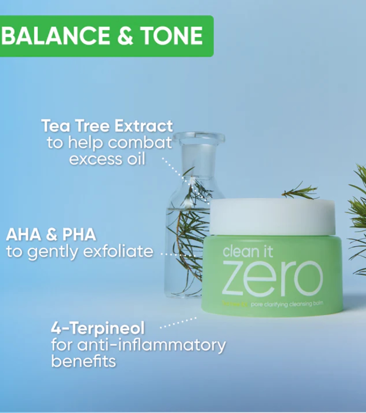 Clean It Zero Tea Tree-EX O bálsamo de limpeza de poros Clean It Zero Tea Tree-EX foi especialmente desenvolvido para peles oleosas e mistas que buscam uma limpeza profunda e refrescante, sem irritação.