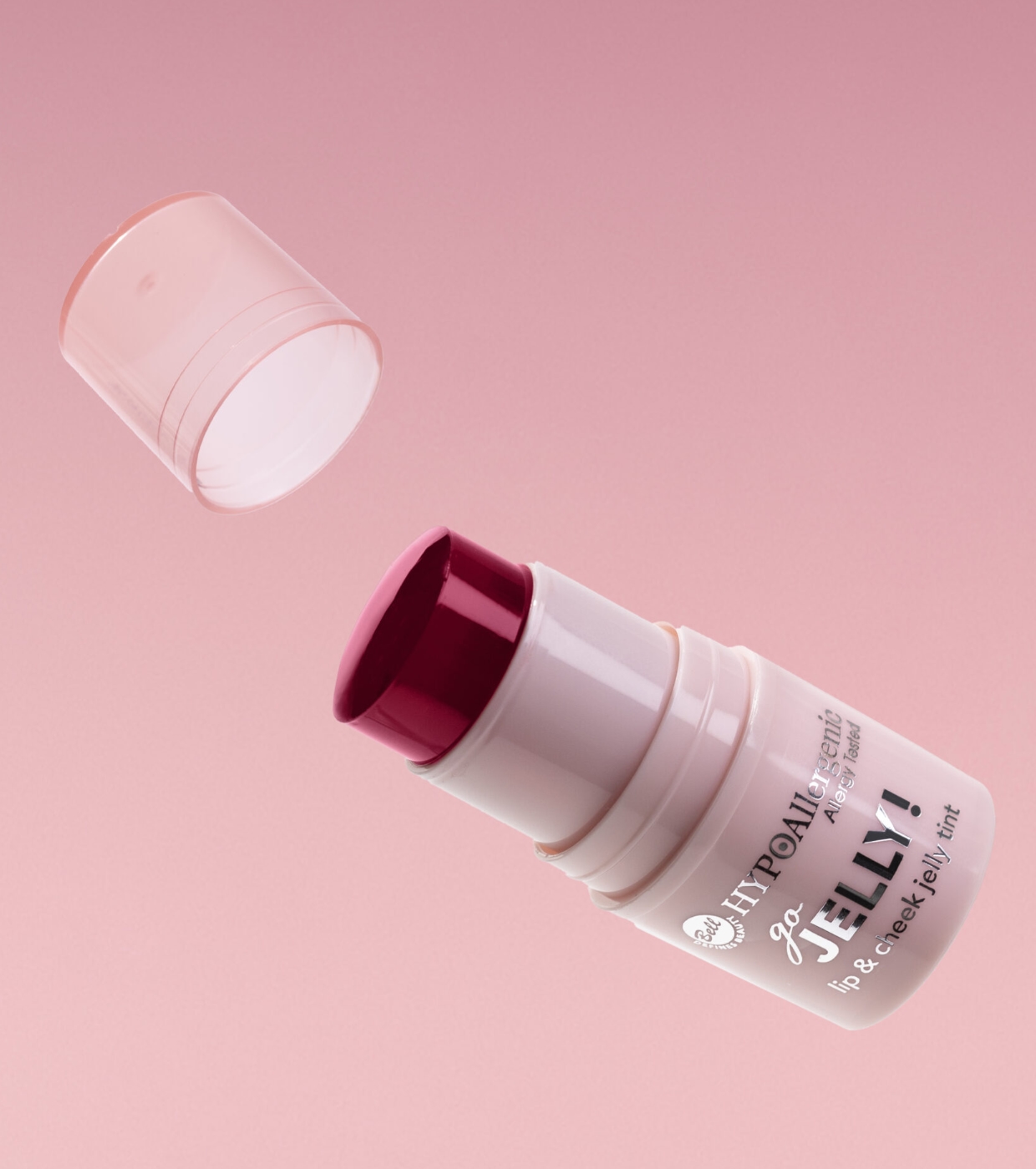 Bell HypoAllergenic Go Jelly! Lip & Cheek Jelly Tint é um bastão multiuso com textura de gel leve, ideal para uso como blush e lip tint.