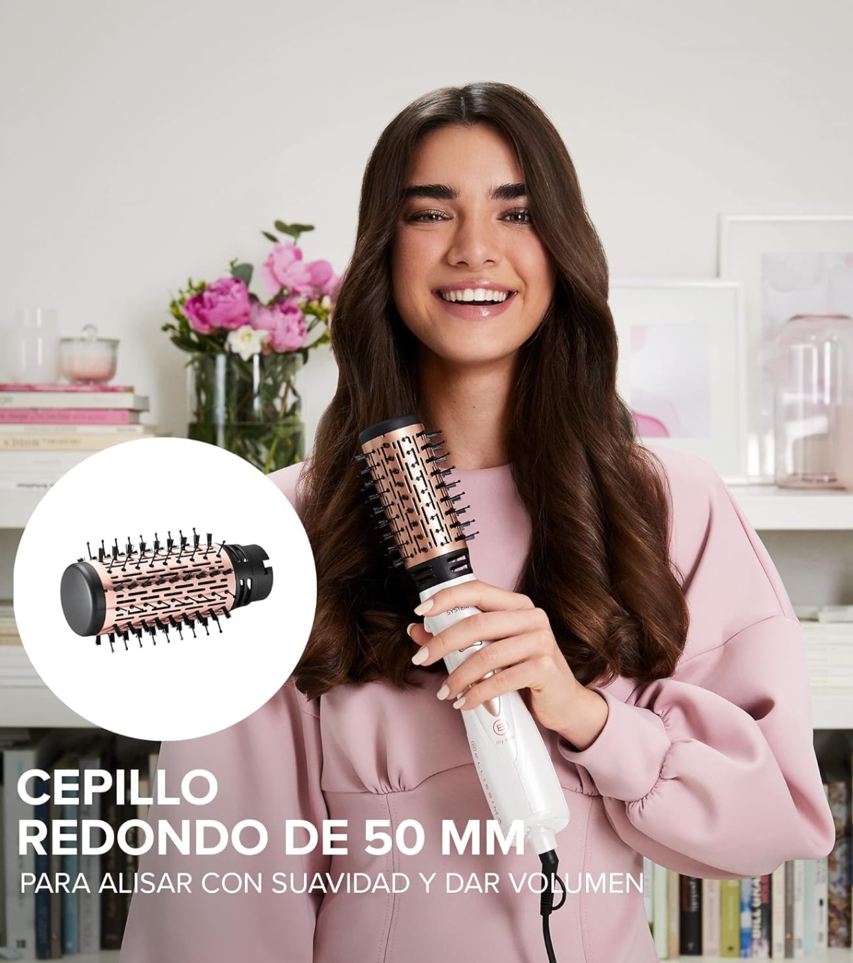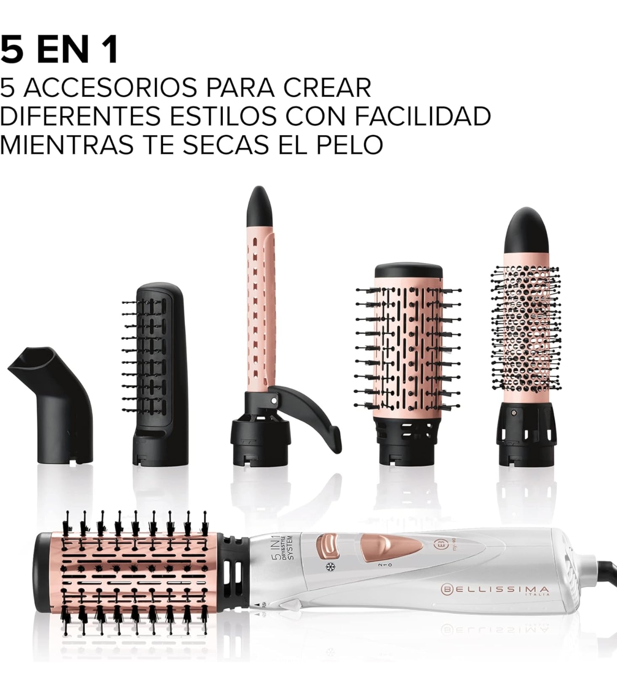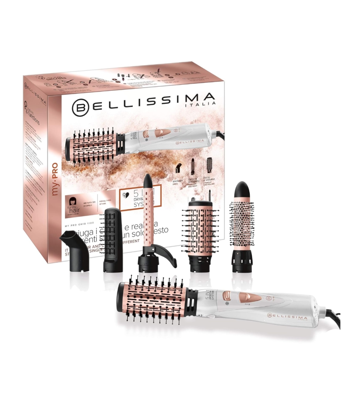 Bellissima Dry&Style System GH18 1100 é a escova de ar quente 5 em 1 que seca e modela em uma única etapa, permitindo que você crie vários estilos: cabelos lisos e volumosos, ondas suaves, pontas modeladas ou cachos definidos.