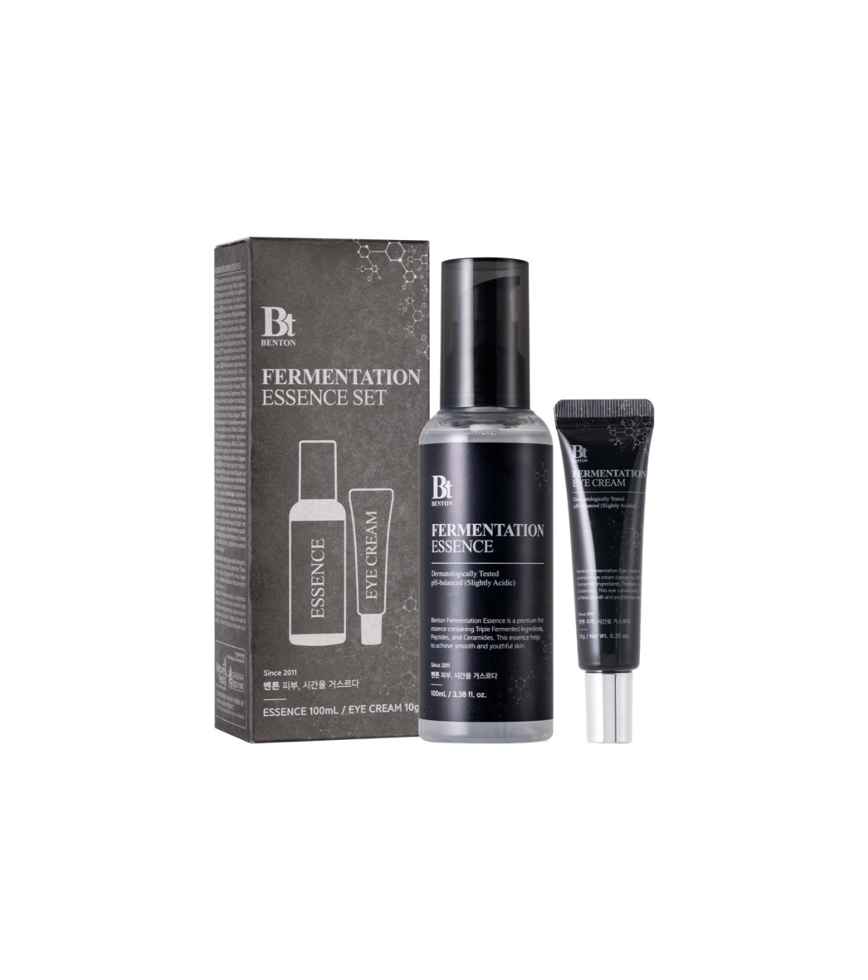 Fermentation Essence Set Kit de 2 produtos da Benton , uma coleção de alta qualidade formulada com ingredientes poderosos como fermento filtrado de Galactomyces, lisado de fermento Bifida, peptídeos e ceramidas, projetado para oferecer resultados visíveis na pele madura.