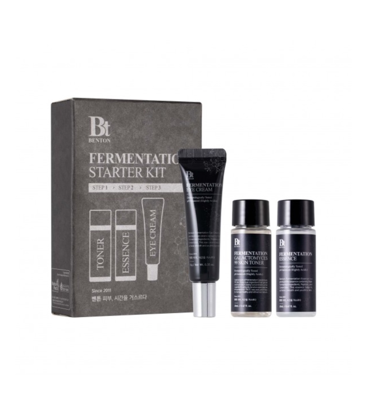 Fermentation Benton Kit de 3 produtos , composto por 3 produtos essenciais formulados com filtrado fermentado de Galactomyces, ingrediente chave para nutrir, acalmar e melhorar a elasticidade da pele.