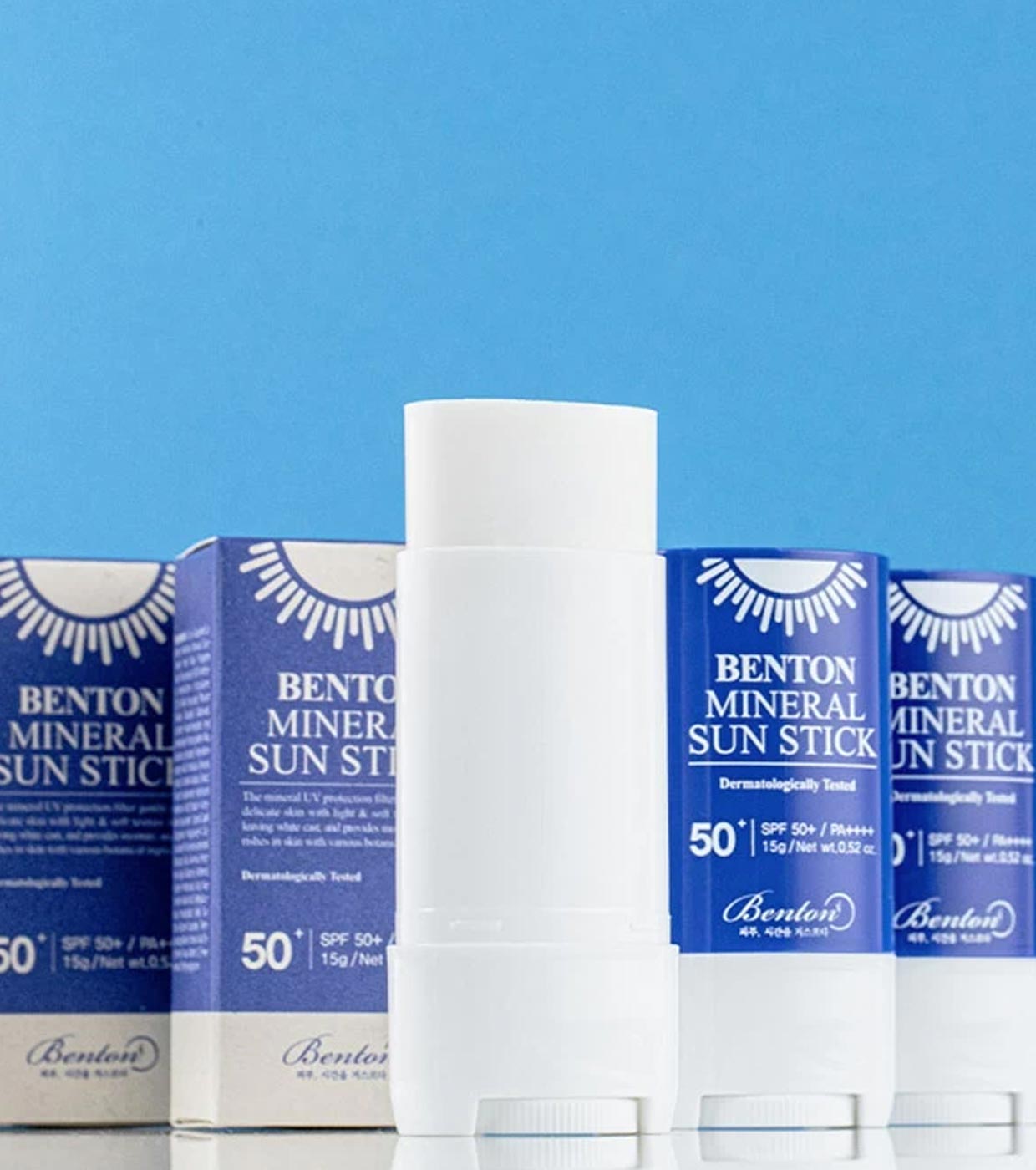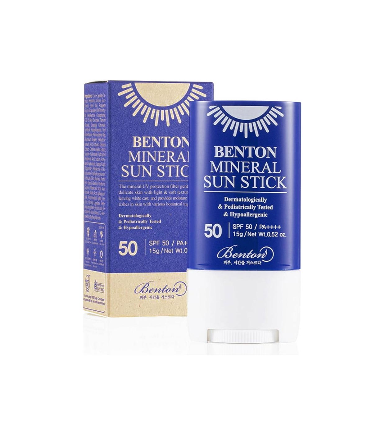Protetor solar mineral Benton SPF50 PA++++ em formato stick , para uma pele perfeitamente protegida do sol.