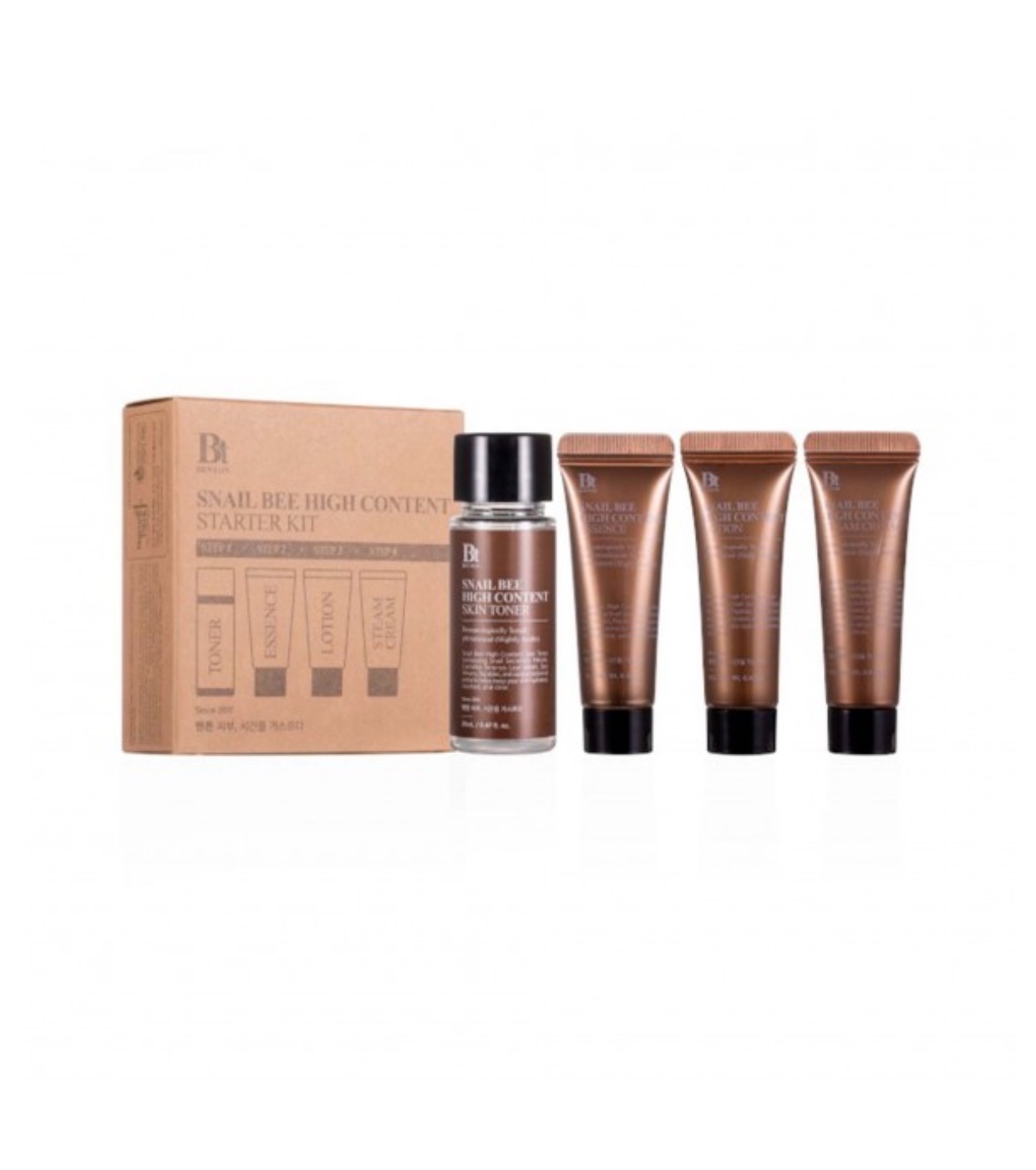 Kit de 4 produtos Starter Kit Snail Bee High Content da Benton , composto por 4 produtos essenciais formulados com mucina de caracol e veneno de abelha, dois ingredientes essenciais para uma pele mais elástica, revitalizada e com aspecto mais saudável.