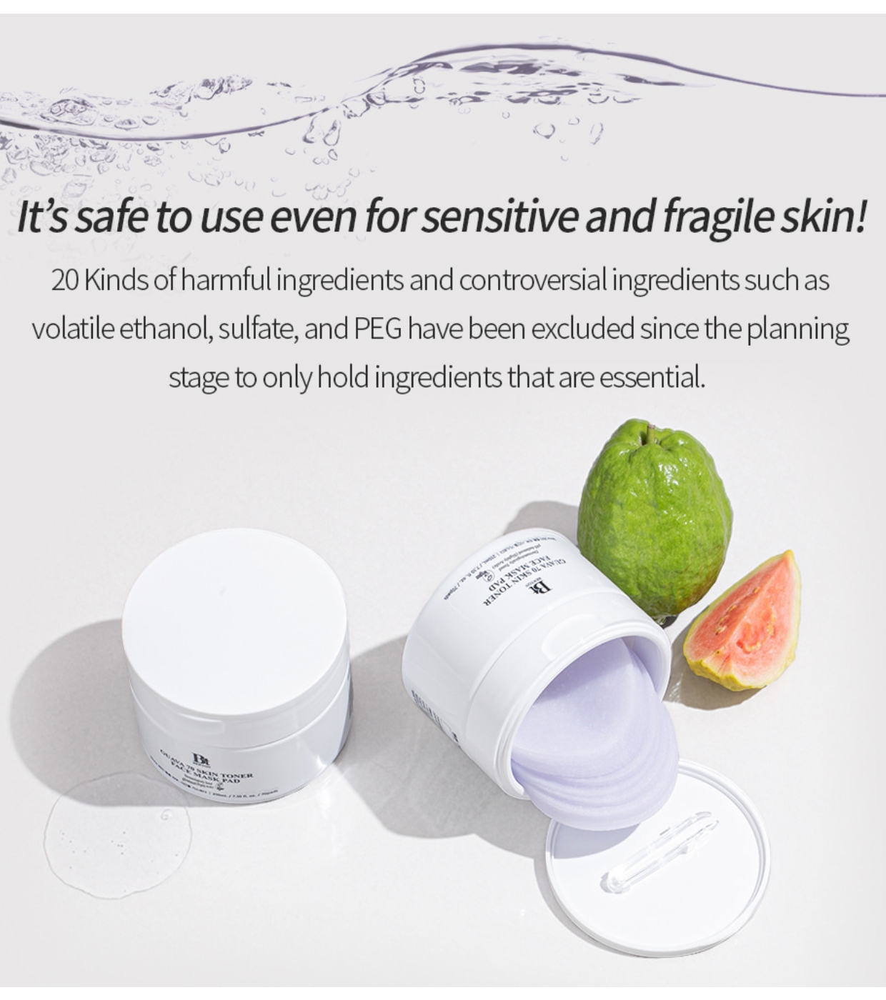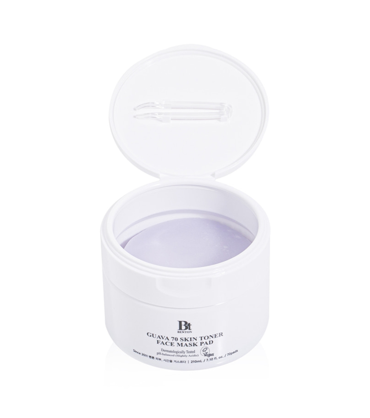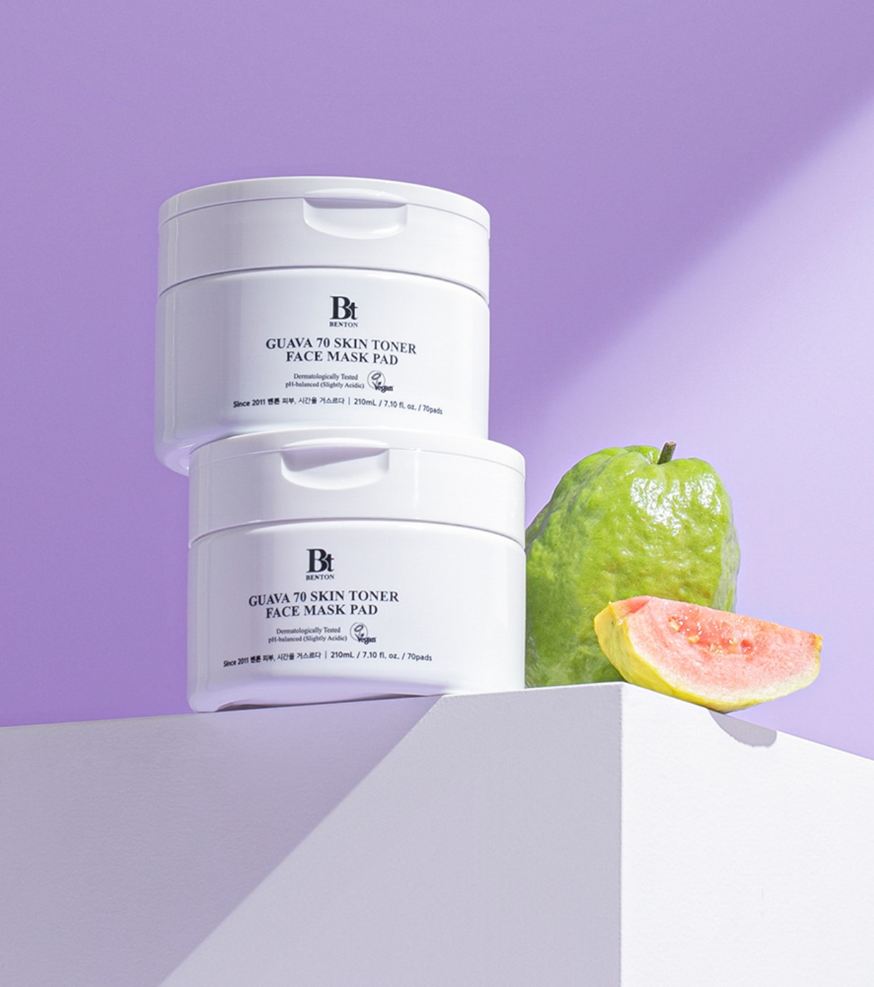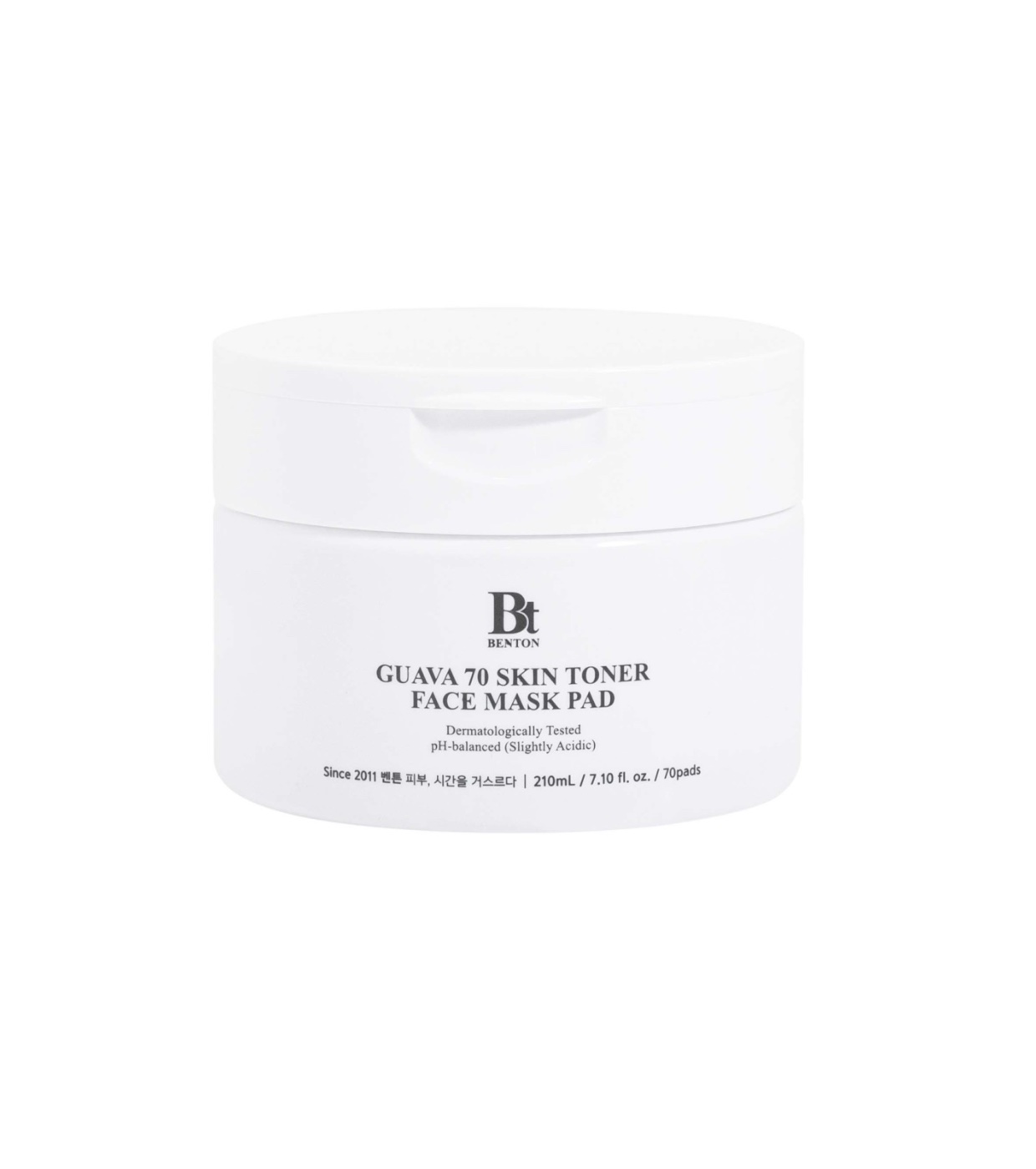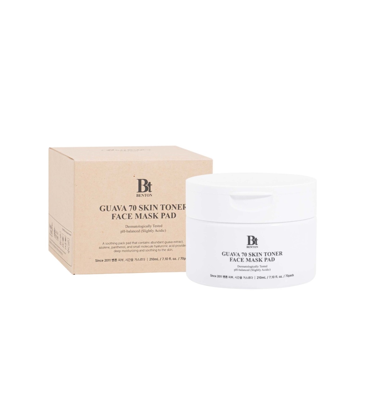 O toner facial hidratante e calmante em formato pads da Benton são discos de algodão impregnados com um toner formulado com extrato de Goiaba, Azuleno, Pantenol e Ácido Hialurônico em pequenas moléculas para proporcionar hidratação mais profunda e ajudar a acalmar a pele.