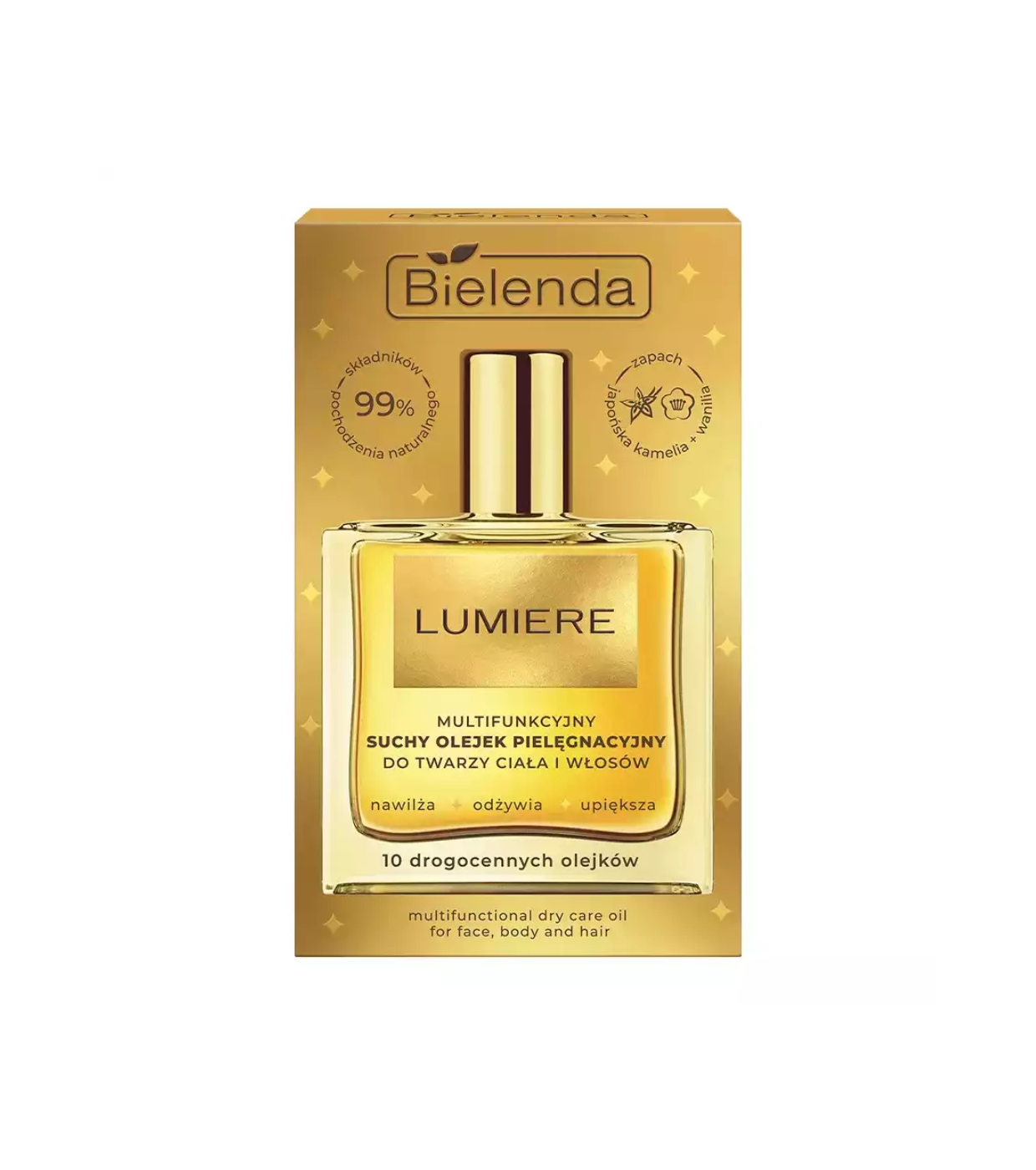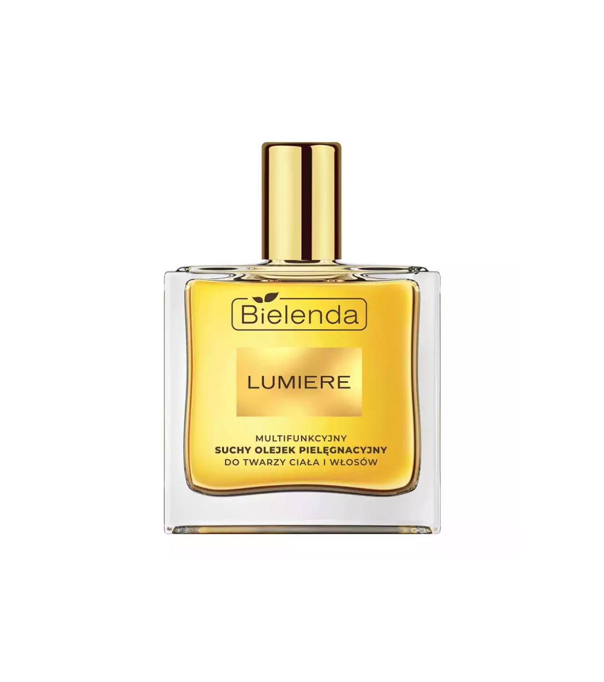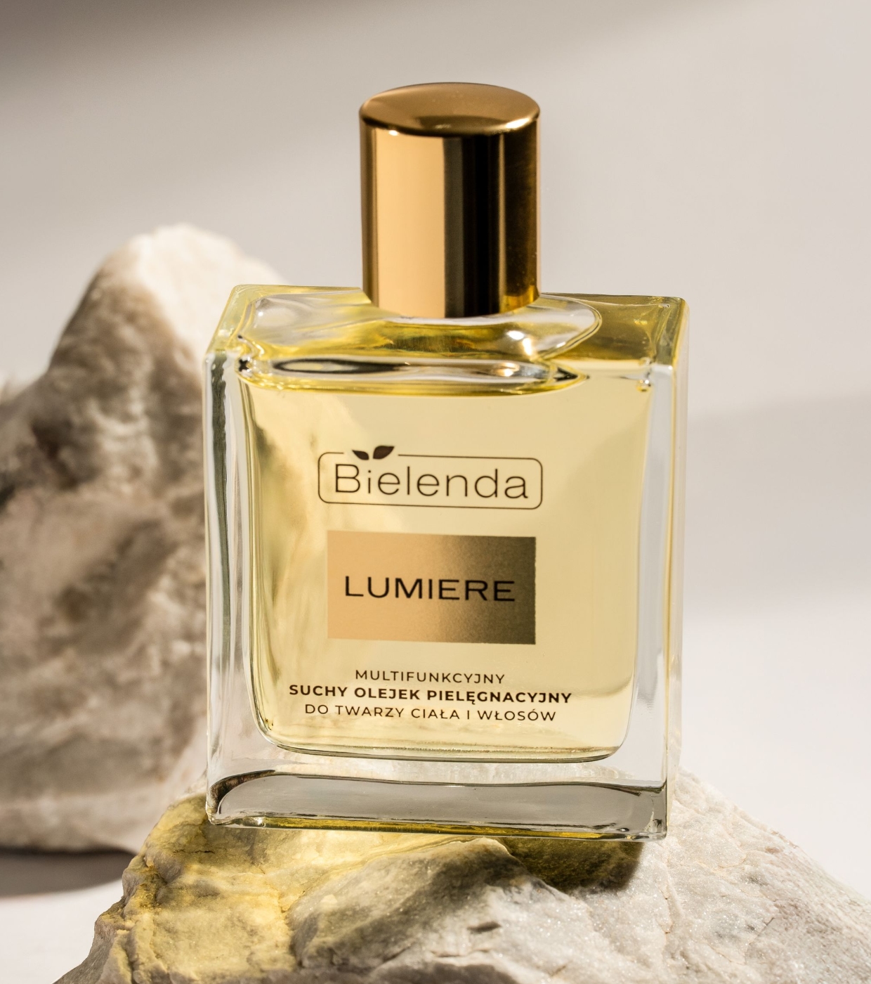 O Óleo Seco Multifuncional Lumiere da Bielenda é uma fórmula de luxo desenvolvida para cuidar da pele do rosto, do corpo e do cabelo em uma única etapa.