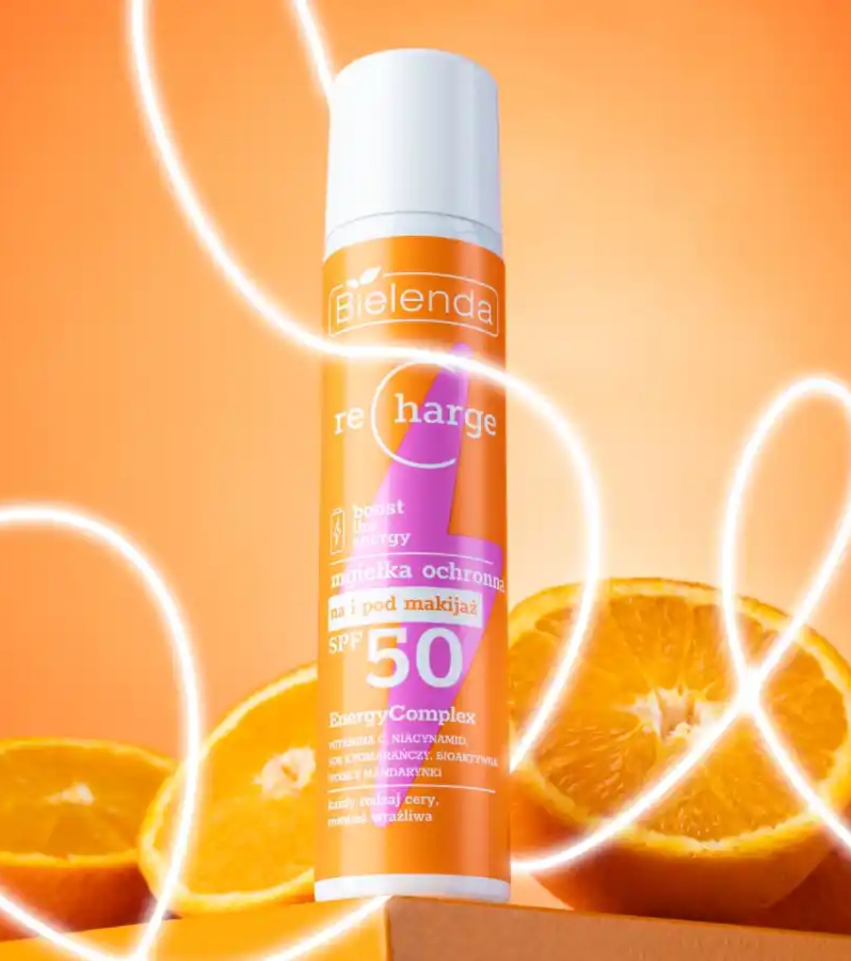 Mantenha a sua pele protegida e radiante em qualquer hora do dia com o spray facial protetor FPS50 da linha Recharge da Bielenda .