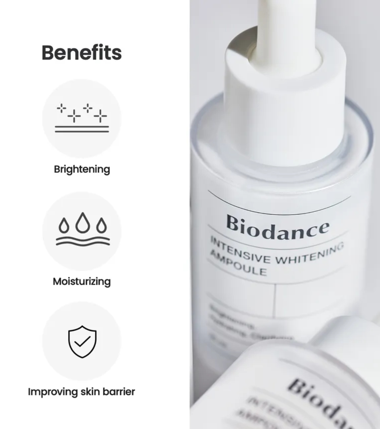 Ilumine, uniformize e hidrate sua pele com a ampola Intensive Whitening da Biodance , um sérum facial de alto desempenho desenvolvido para tratar manchas escuras, pigmentação irregular e perda de luminosidade.