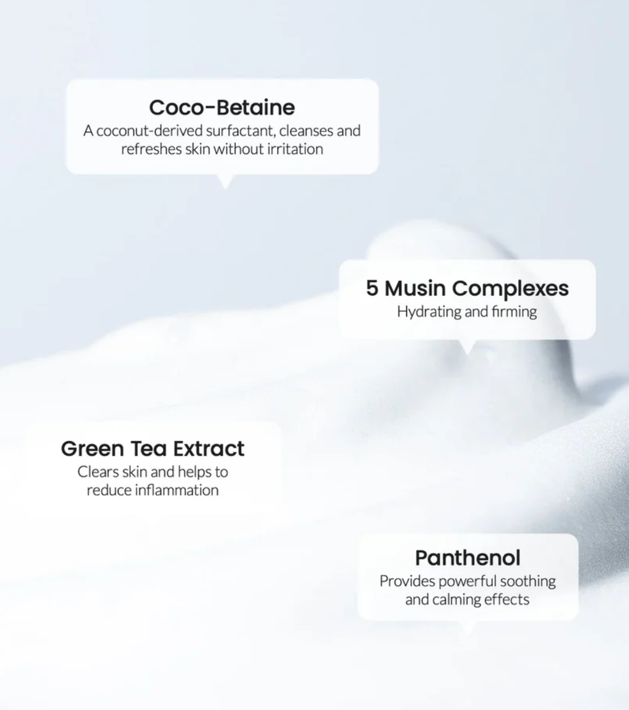 - Complexo de 5 tipos de mucina: reforça a hidratação, melhora a elasticidade e acalma irritações.