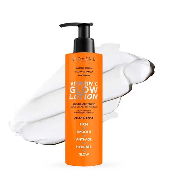 Biovène Hidratante Corporal com Vitamina C e Banana Orgânica para ajudar a hidratar a pele seca e restaurar seu verdadeiro brilho enquanto nutre uma textura de pele firme, suave e flexível.