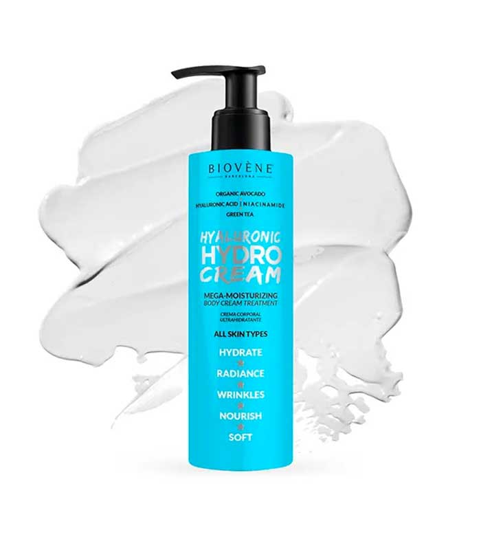 Hidratante corporal Biovène com ácido hialurônico e abacate orgânico que nutre intensamente a pele para ajudar a restaurar sua barreira protetora e devolver imediatamente suavidade sedosa ao toque.