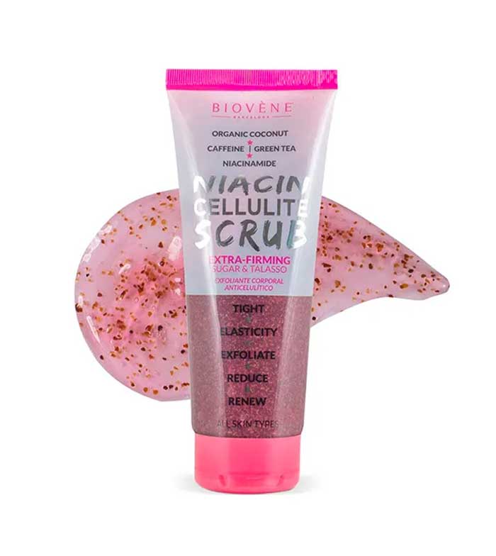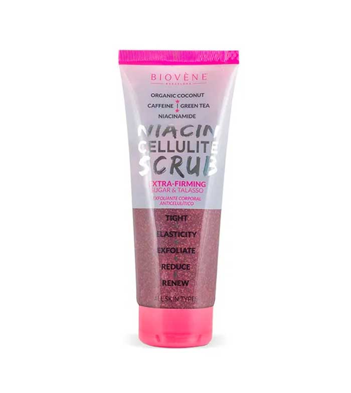 Esfoliante corporal anticelulítico Niacin Cellulite extra refirmante da Biovène com niacinamida reparadora e coco orgânico.