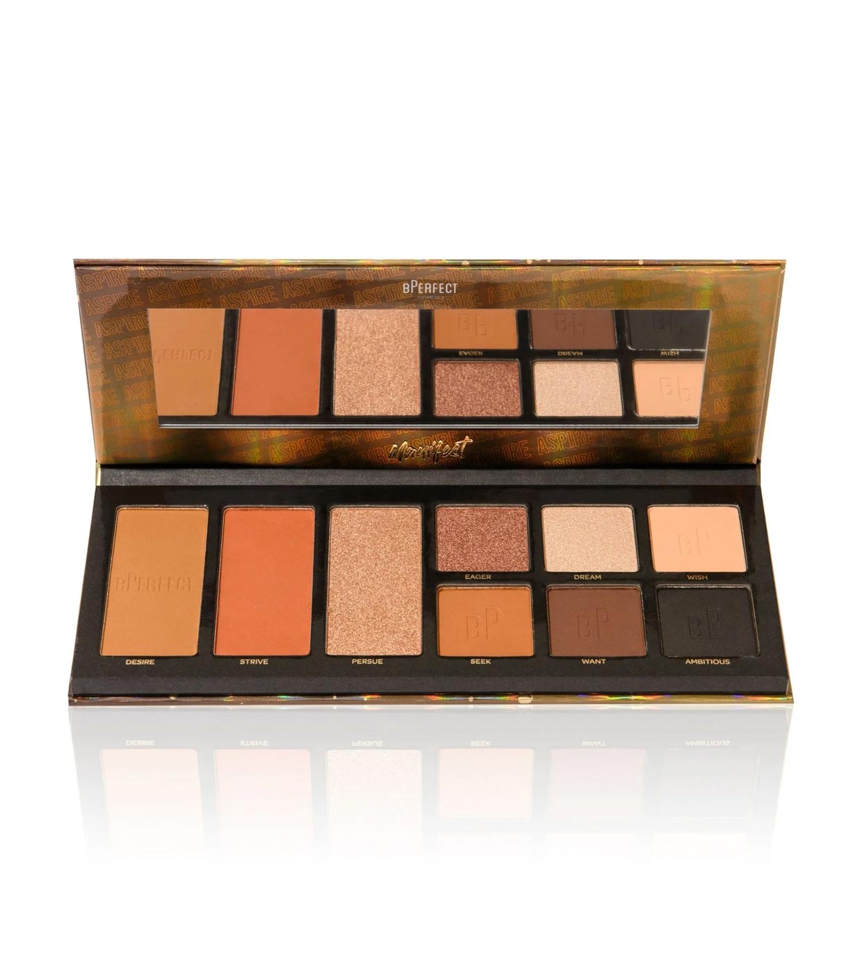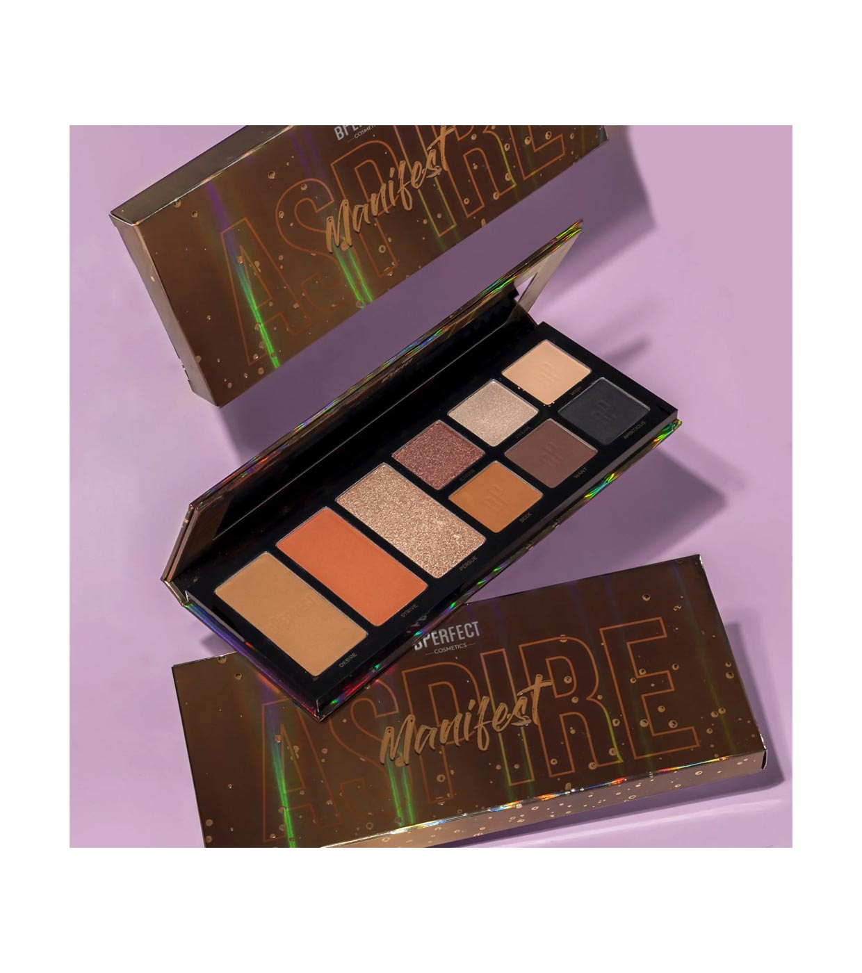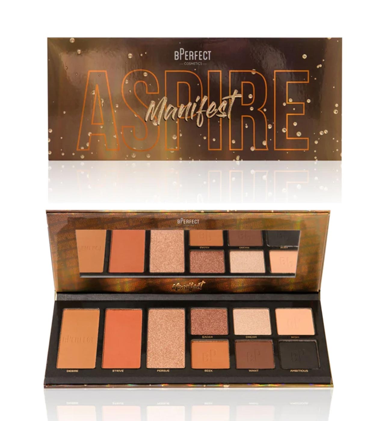 Um rosto perfeito com a paleta de rosto e olhos BPerfect Manifest Aspire.