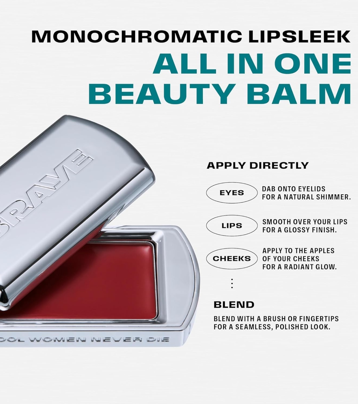 Lipsleek da BRAYE é um bálsamo multifuncional para lábios e bochechas que hidrata profundamente e proporciona uma cor suave e modulável com um acabamento aveludado semimate.