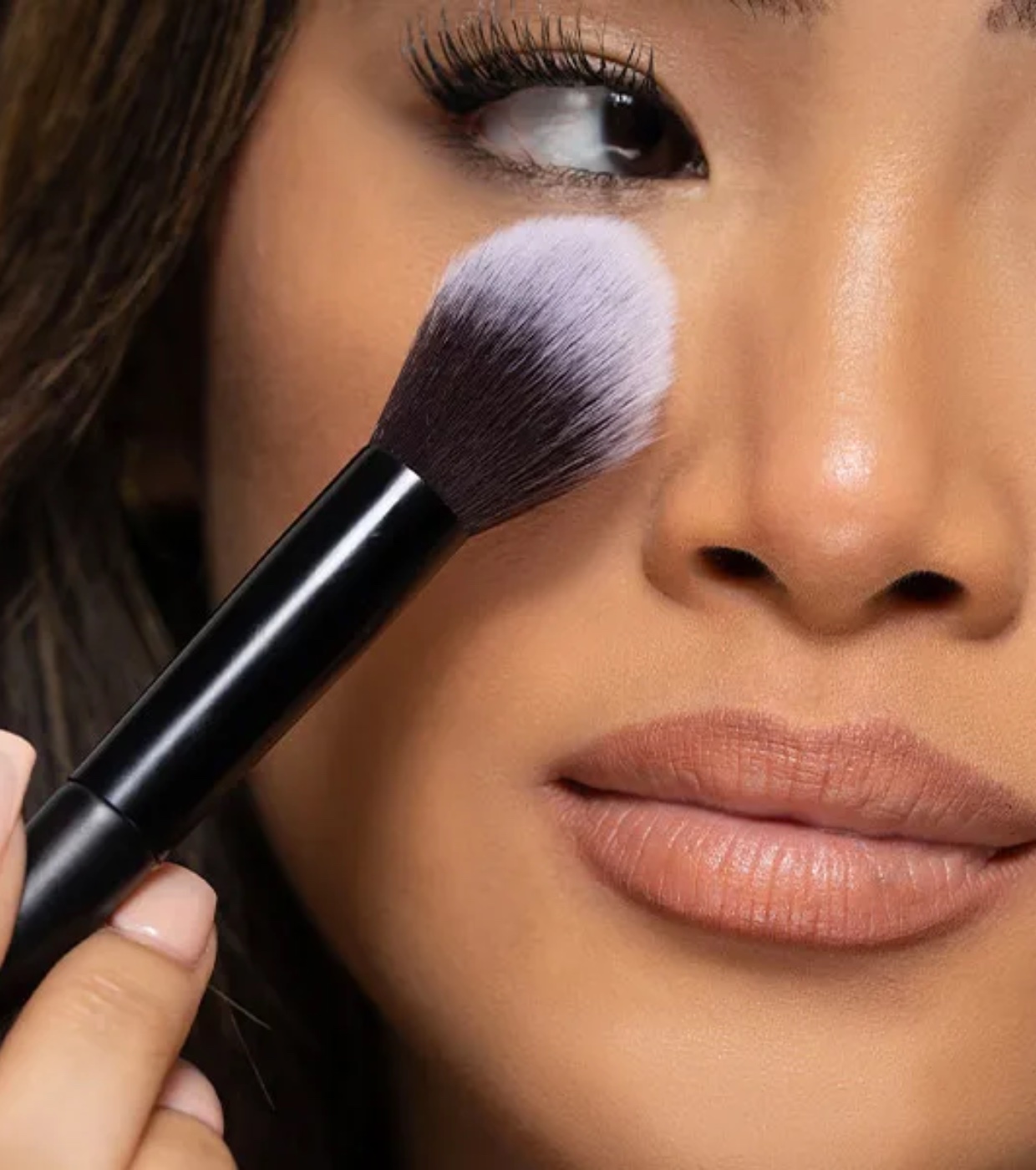 Seu formato compacto e angular permite destacar áreas importantes, como as maçãs do rosto, o arco do cupido e a ponte do nariz, com controle total.