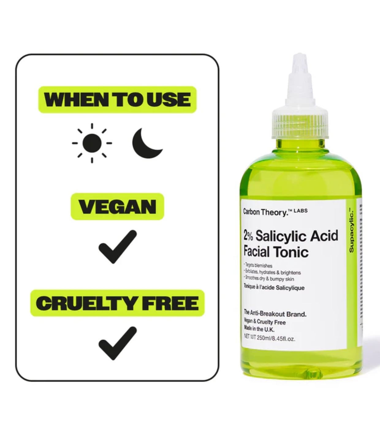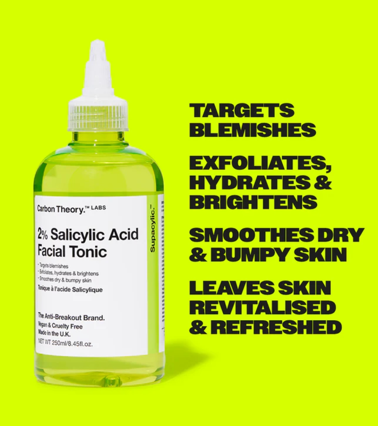 Carbon Theory O tônico facial com 2% de ácido salicílico (BHA) é a solução definitiva para combater manchas, limpar profundamente os poros e revitalizar a pele.
