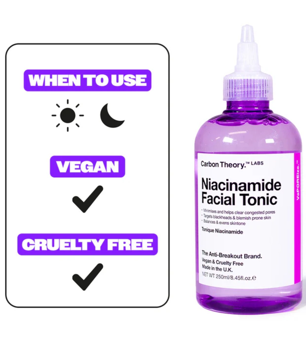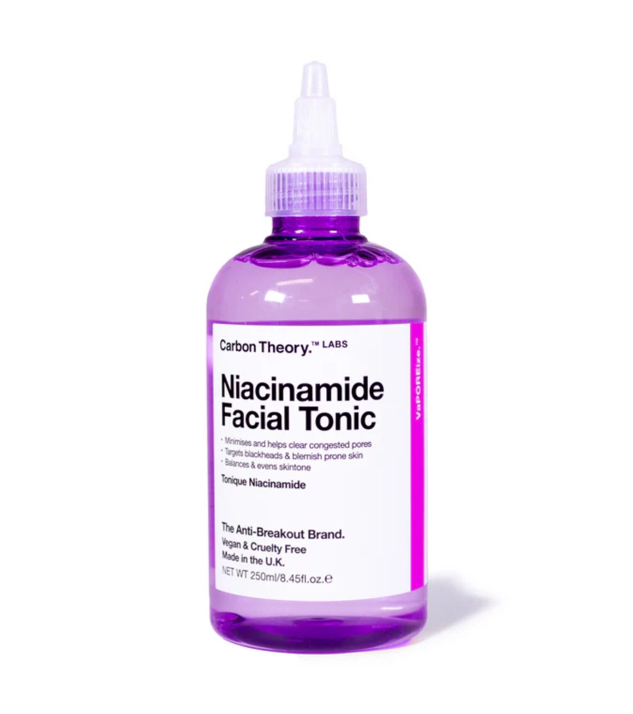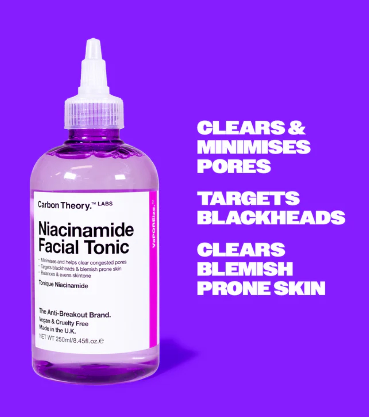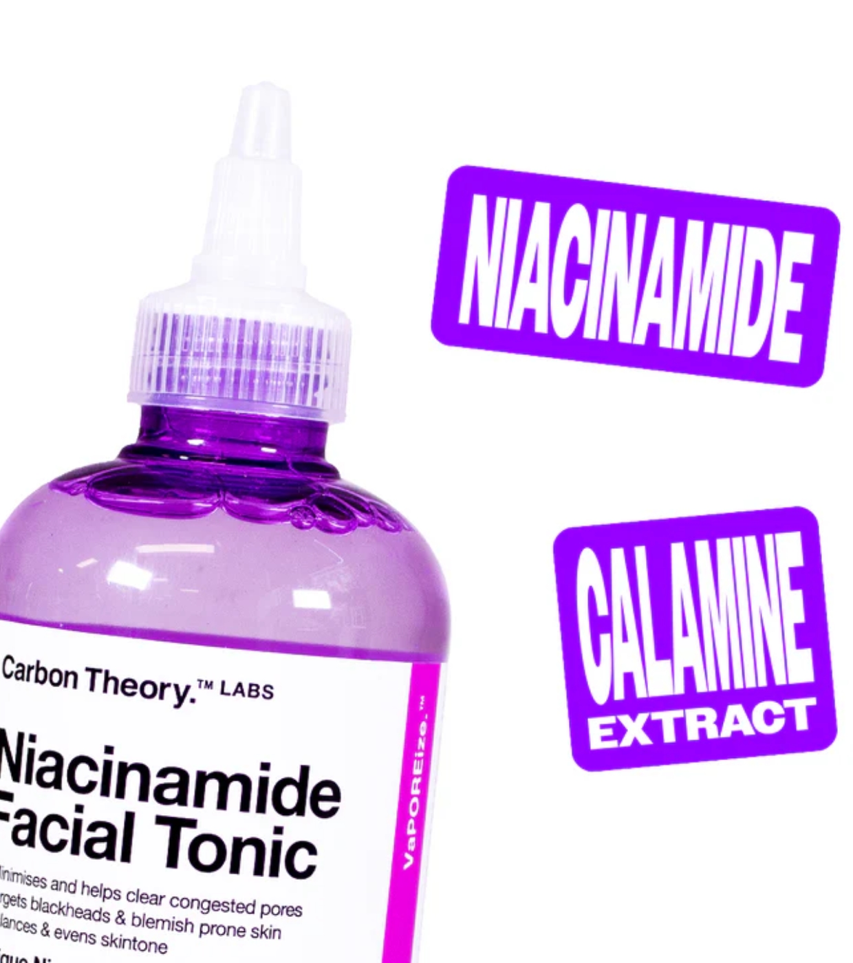 Carbon Theory O Tônico Facial de Niacinamida é a solução perfeita para peles propensas a manchas, pois limpa profundamente, regula o excesso de oleosidade e minimiza os poros sem ressecar ou comprometer a barreira natural da pele.