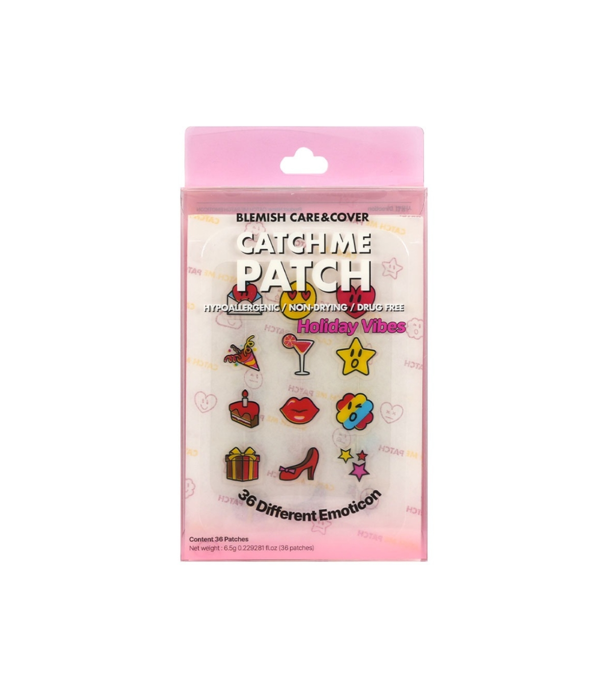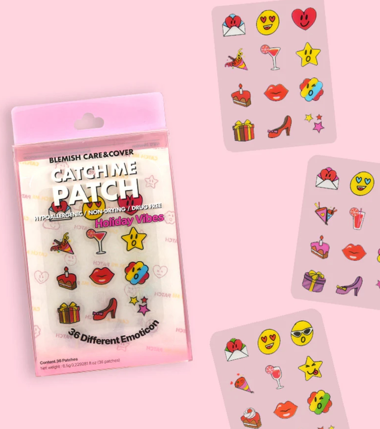 Holiday Vibes adesivos para imperfeições da Catch Me Patch , um adesivo hidrocoloide para imperfeições que ajuda a tratar espinhas e pequenas lesões na pele, protegendo-a ao mesmo tempo.