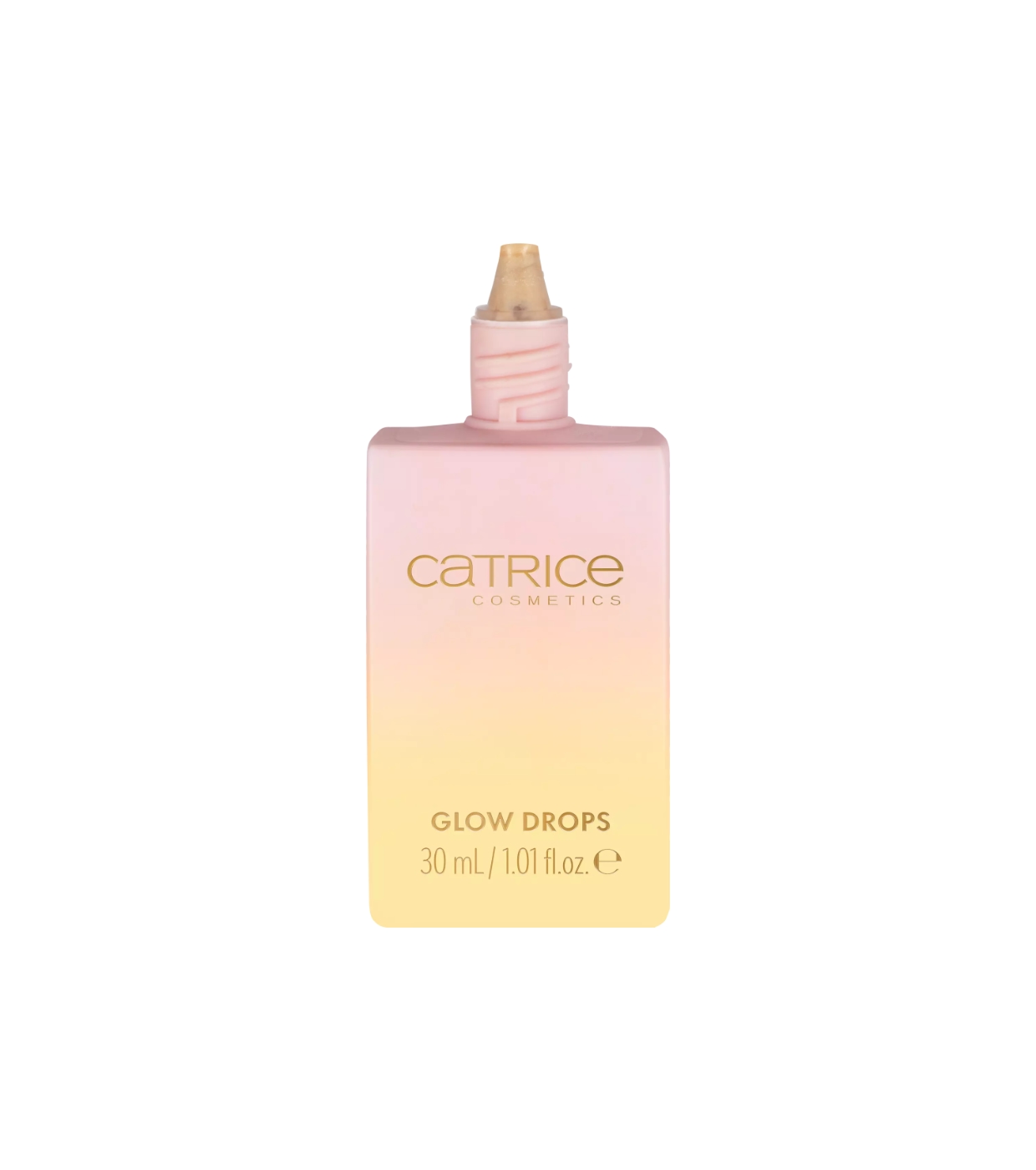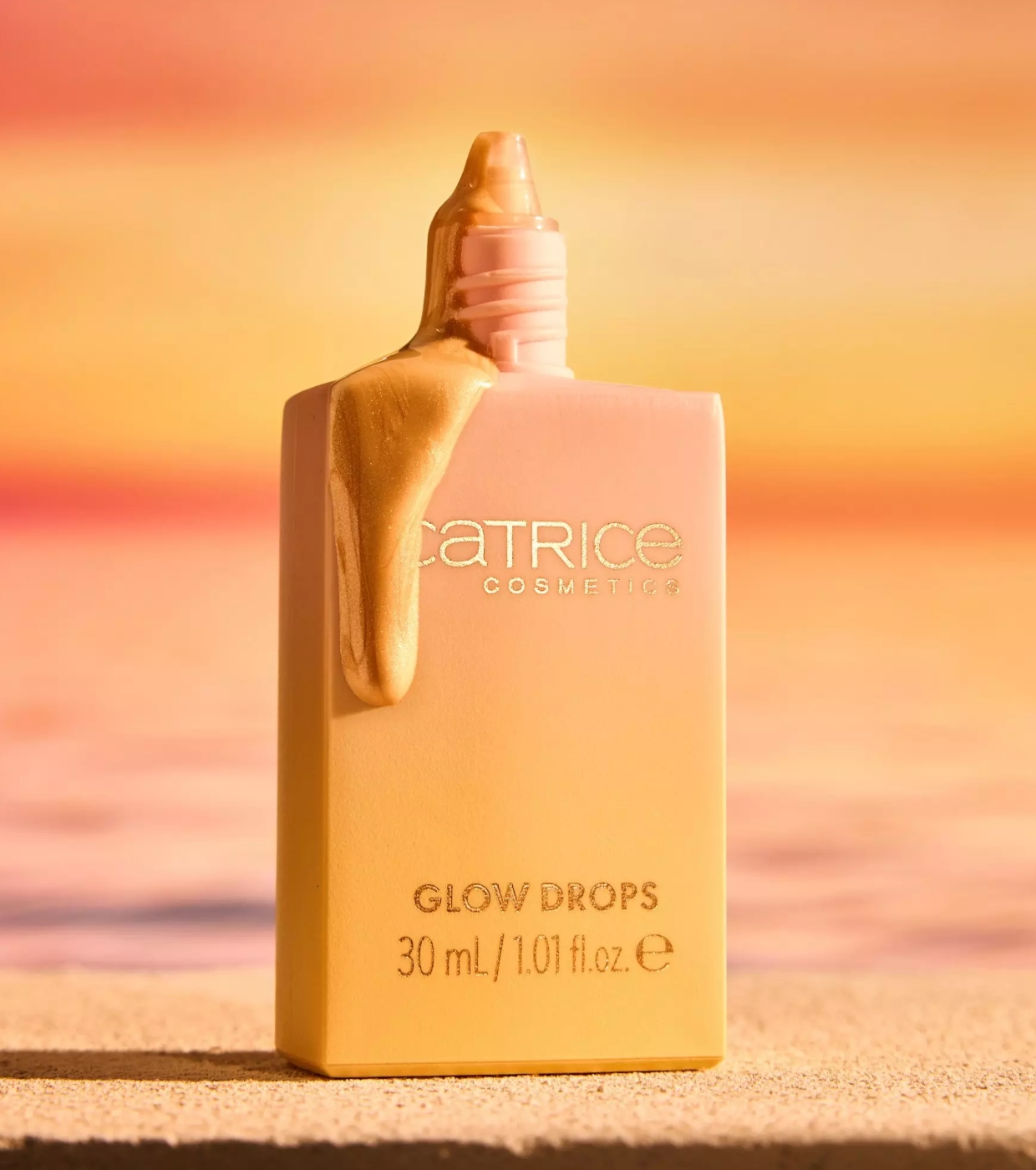 Ilumine seu rosto com o brilho da hora dourada graças a essas gotas iluminadoras Catrice em um tom claro com um fundo dourado.