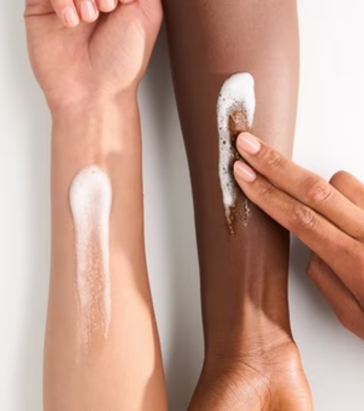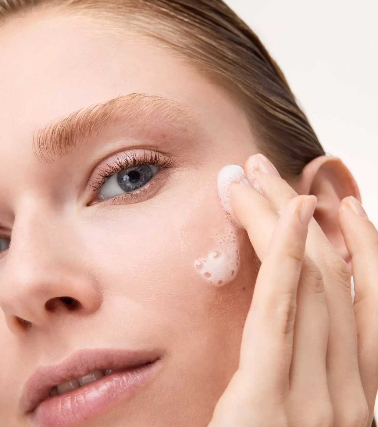 Sua textura leve e vaporosa em espuma proporciona uma experiência sensorial suave, deixando um tom rosa translúcido com finos brilhos dourados que iluminam a pele instantaneamente.