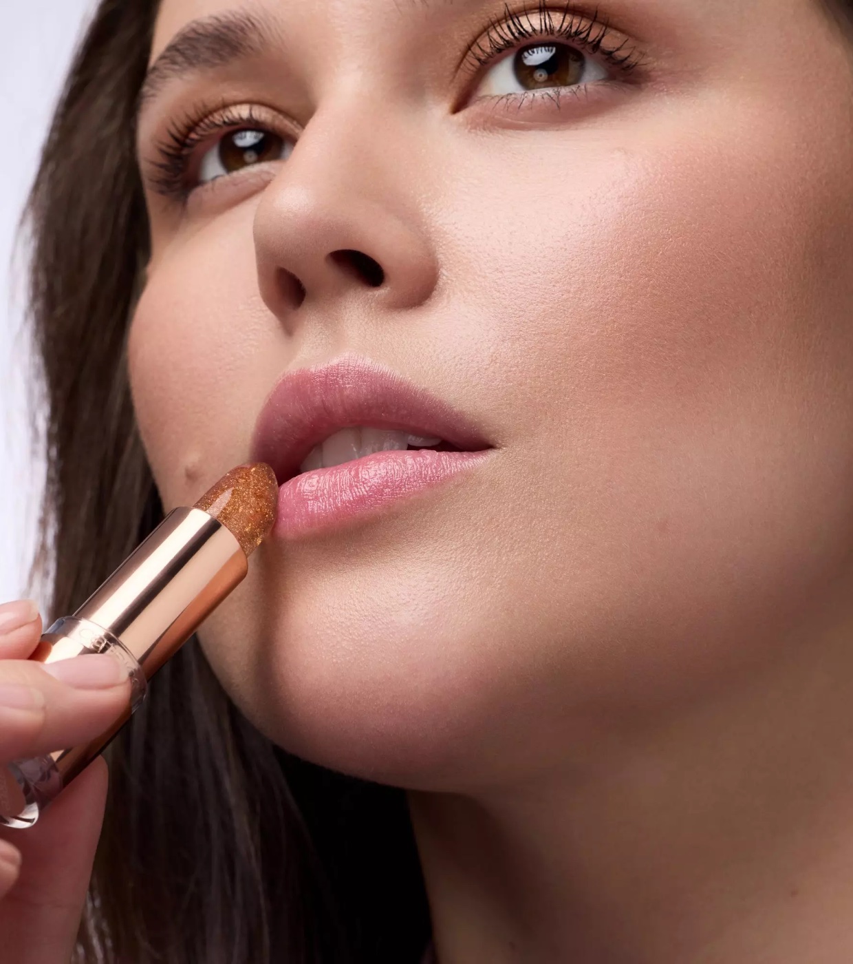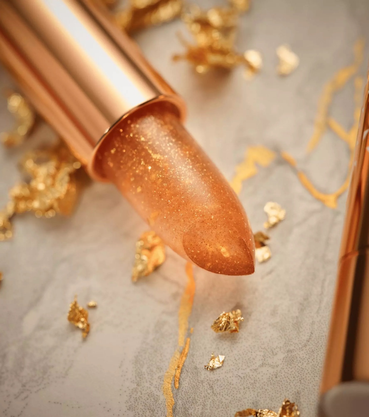 Sua fórmula inovadora com glitter e folhas douradas não só hidrata intensamente, mas também transforma a cor dos seus lábios com um tom rosado único, adaptando-se ao seu pH natural.